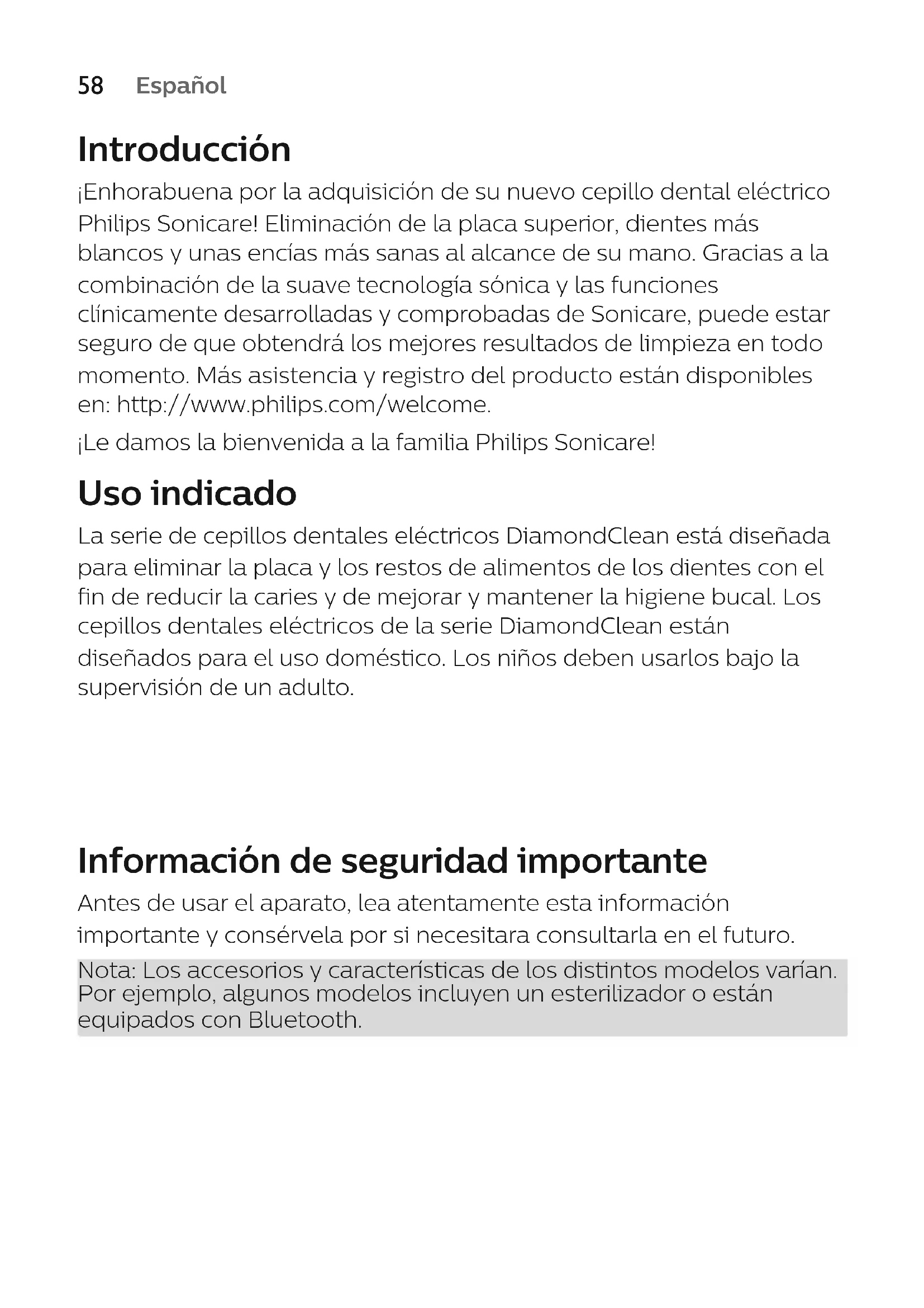 DeutschEspañol Introducción ¡Enhorabuena por la adquisición de su nuevo cepillo dental eléctrico Philips Sonicare! Eliminación de la placa superior, dientes más blancos y unas encías más sanas al alcance de su mano. Gracias a la combinación de la suave tecnología sónica y las funciones clínicamente desarrolladas y comprobadas de Sonicare, puede estar seguro de que obtendrá los mejores resultados de limpieza en todo momento. Más asistencia y registro del producto están disponibles en: http://www.philips.com/welcome. ¡Le damos la bienvenida a la familia Philips Sonicare! Uso indicado La serie de cepillos dentales eléctricos DiamondClean está diseñada para eliminar la placa y los restos de alimentos de los dientes con el fin de reducir la caries y de mejorar y mantener la higiene bucal. Los cepillos dentales eléctricos de la serie DiamondClean están diseñados para el uso doméstico. Los niños deben usarlos bajo la supervisión de un adulto. Información de seguridad importante Antes de usar el aparato, lea atentamente esta información importante y consérvela por si necesitara consultarla en el futuro. Nota: Los accesorios y características de los distintos modelos varían. Por ejemplo, algunos modelos incluyen un esterilizador o están equipados con Bluetooth.