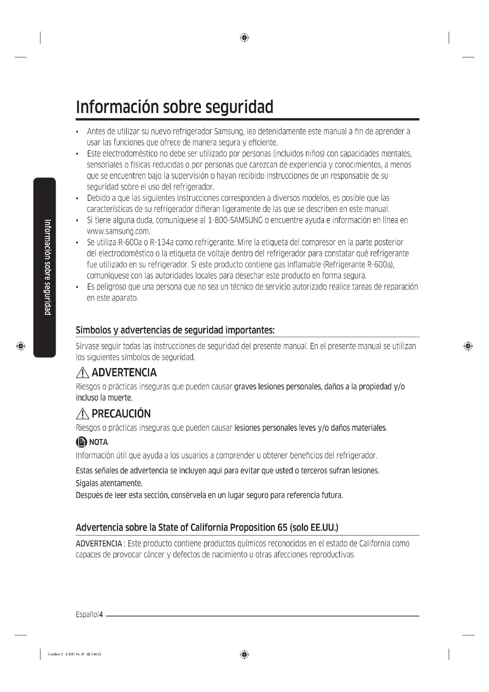 - Es peligroso que una persona que no sea un técnico de servicio autorizado realice tareas de reparación en este aparato. Símbolos y advertencias de seguridad importantes: Sírvase seguir todas las instrucciones de seguridad del presente manual. En el presente manual se utilizan los siguientes símbolos de seguridad. ADVERTENCIA Riesgos o prácticas inseguras que pueden causar graves lesiones personales, daños a la propiedad y/o incluso la muerte. PRECAUCIÓN Riesgos o prácticas inseguras que pueden causar lesiones personales leves y/o daños materiales. NOTA Información útil que ayuda a los usuarios a comprender u obtener benecios del refrigerador. Estas señales de advertencia se incluyen aquí para evitar que usted o terceros sufran lesiones. Sígalas atentamente. Después de leer esta sección, consérvela en un lugar seguro para referencia futura. Advertencia sobre la State of California Proposition 65 (solo EE.UU.) ADVERTENCIA : Este producto contiene productos químicos reconocidos en el estado de California como capaces de provocar cáncer y defectos de nacimiento u otras afecciones reproductivas. Información sobre seguridad Untitled-2 4 2017-04-19 3:46:22Español 5 Información sobre seguridad Advertencias muy importantes para la instalación ADVERTENCIA