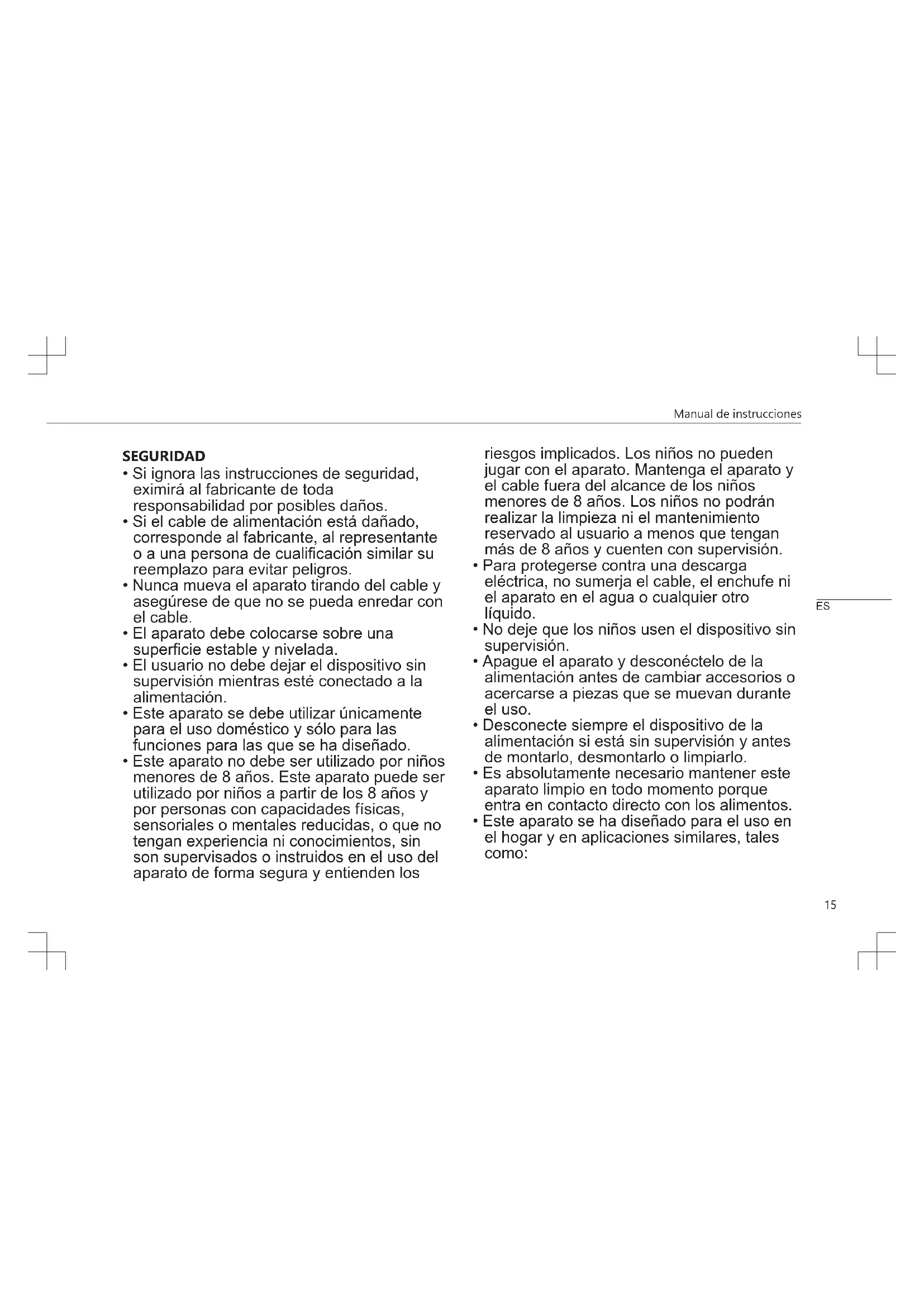 - Este aparato no debe ser utilizado por niños menores de 8 años. Este aparato puede ser utilizado por niños a partir de los 8 años y por personas con capacidades físicas, sensoriales o mentales reducidas, o que no tengan experiencia ni conocimientos, sin son supervisados o instruidos en el uso del aparato de forma segura y entienden los riesgos implicados. Los niños no pueden jugar con el aparato. Mantenga el aparato y el cable fuera del alcance de los niños menores de 8 años. Los niños no podrán realizar la limpieza ni el mantenimiento reservado al usuario a menos que tengan más de 8 años y cuenten con supervisión.