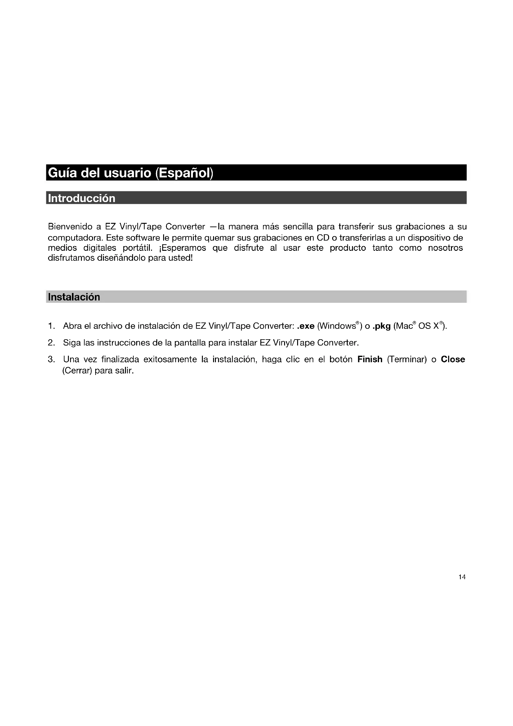 Guía del usuario (Español) Introducción Bienvenido a EZ Vinyl/Tape Converter —la manera más sencilla para transferir sus grabaciones a su computadora. Este software le permite quemar sus grabaciones en CD o transferirlas a un dispositivo de medios digitales portátil. ¡Esperamos que disfrute al usar este producto tanto como nosotros disfrutamos diseñándolo para usted!
