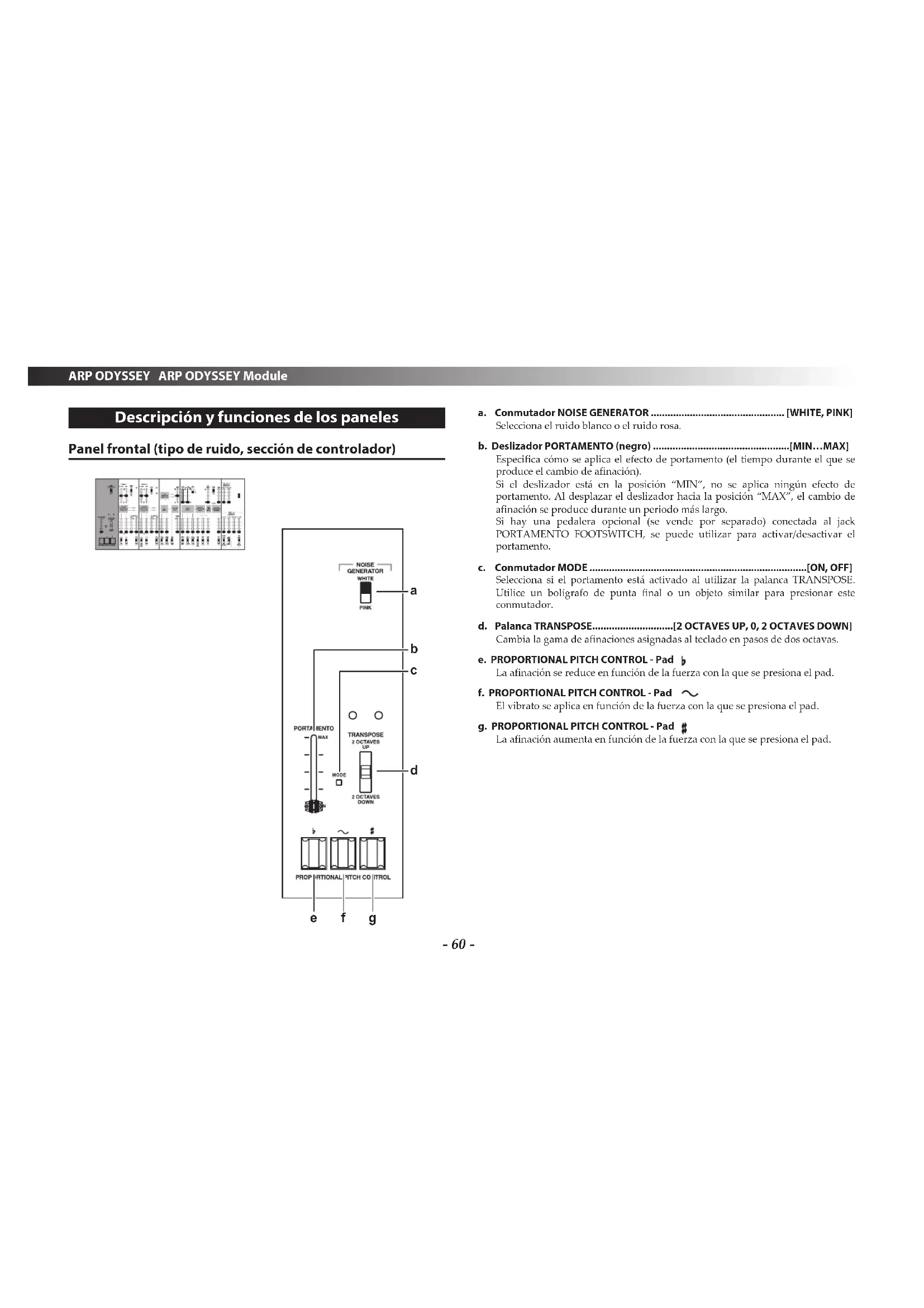f g a. Conmutador NOISE GENERATOR ................................................ [WHITE, PINK] Selecciona el ruido blanco o el ruido rosa. b. Deslizador PORTAMENTO (negro) .................................................[MIN…MAX] Especifica cómo se aplica el efecto de portamento (el tiempo durante el que se produce el cambio de afinación). Si el deslizador está en la posición “MIN”, no se aplica ningún efecto de portamento. Al desplazar el deslizador hacia la posición “MAX”, el cambio de afinación se produce durante un periodo más largo. Si hay una pedalera opcional (se vende por separado) conectada al jack PORTAMENTO FOOTSWITCH, se puede utilizar para activar/desactivar el portamento. c. Conmutador MODE ..............................................................................[ON, OFF] Selecciona si el portamento está activado al utilizar la palanca TRANSPOSE. Utilice un bolígrafo de punta final o un objeto similar para presionar este conmutador. d. Palanca TRANSPOSE ............................. [2 OCTAVES UP, 0, 2 OCTAVES DOWN] Cambia la gama de afinaciones asignadas al teclado en pasos de dos octavas. e. PROPORTIONAL PITCH CONTROL - Pad La afinación se reduce en función de la fuerza con la que se presiona el pad. f. PROPORTIONAL PITCH CONTROL - Pad El vibrato se aplica en función de la fuerza con la que se presiona el pad. g. PROPORTIONAL PITCH CONTROL - Pad La afinación aumenta en función de la fuerza con la que se presiona el pad.- 61 - Manual de usuario Panel frontal (sección VCO-1)