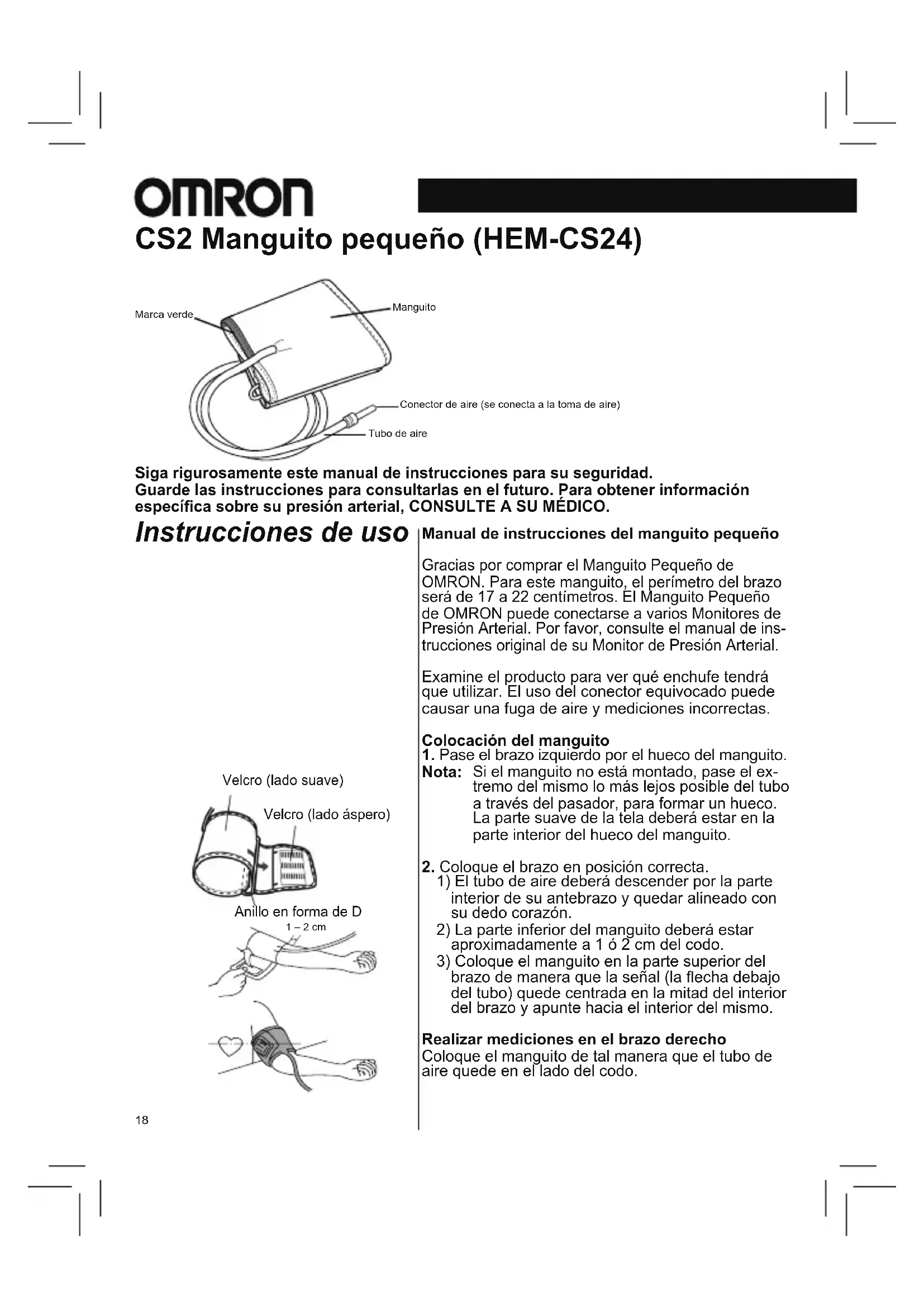 brazo de manera que la señal (la echa debajo del tubo) quede centrada en la mitad del interior del brazo y apunte hacia el interior del mismo. Realizar mediciones en el brazo derecho Coloque el manguito de tal manera que el tubo de aire quede en el lado del codo. Siga rigurosamente este manual de instrucciones para su seguridad. Guarde las instrucciones para consultarlas en el futuro. Para obtener información especíca sobre su presión arterial, CONSULTE A SU MÉDICO. CS2 Manguito pequeño (HEM-CS24) Instrucciones de uso Marca verdeManguitoConector de aire (se conecta a la toma de aire)Tubo de aire Pile side material Sewn hook material D-ring 1 – 2 cm Velcro (lado suave)Velcro (lado áspero)Anillo en forma de D1 – 2 cmES