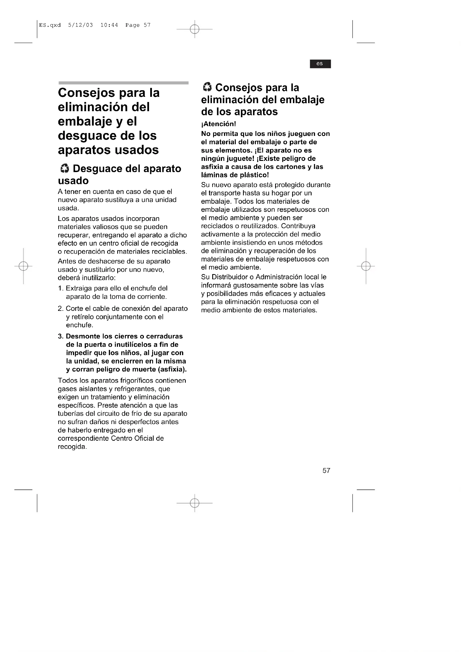 de la puerta o inutilícelos a fin de impedir que los niños, al jugar con la unidad, se encierren en la misma y corran peligro de muerte (asfixia). Todos los aparatos frigoríficos contienen gases aislantes y refrigerantes, que exigen un tratamiento y eliminación específicos. Preste atención a que las tuberías del circuito de frío de su aparato no sufran daños ni desperfectos antes de haberlo entregado en el correspondiente Centro Oficial de recogida. Consejos para la eliminación del embalaje de los aparatos ¡Atención! No permita que los niños jueguen con el material del embalaje o parte de sus elementos. ¡El aparato no es ningún juguete! ¡Existe peligro de asfixia a causa de los cartones y las láminas de plástico! Su nuevo aparato está protegido durante el transporte hasta su hogar por un embalaje. Todos los materiales de embalaje utilizados son respetuosos con el medio ambiente y pueden ser reciclados o reutilizados. Contribuya activamente a la protección del medio ambiente insistiendo en unos métodos de eliminación y recuperación de los materiales de embalaje respetuosos con el medio ambiente. Su Distribuidor o Administración local le informará gustosamente sobre las vías y posibilidades más eficaces y actuales para la eliminación respetuosa con el medio ambiente de estos materiales. ES.qxd 5/12/03 10:44 Page 5758