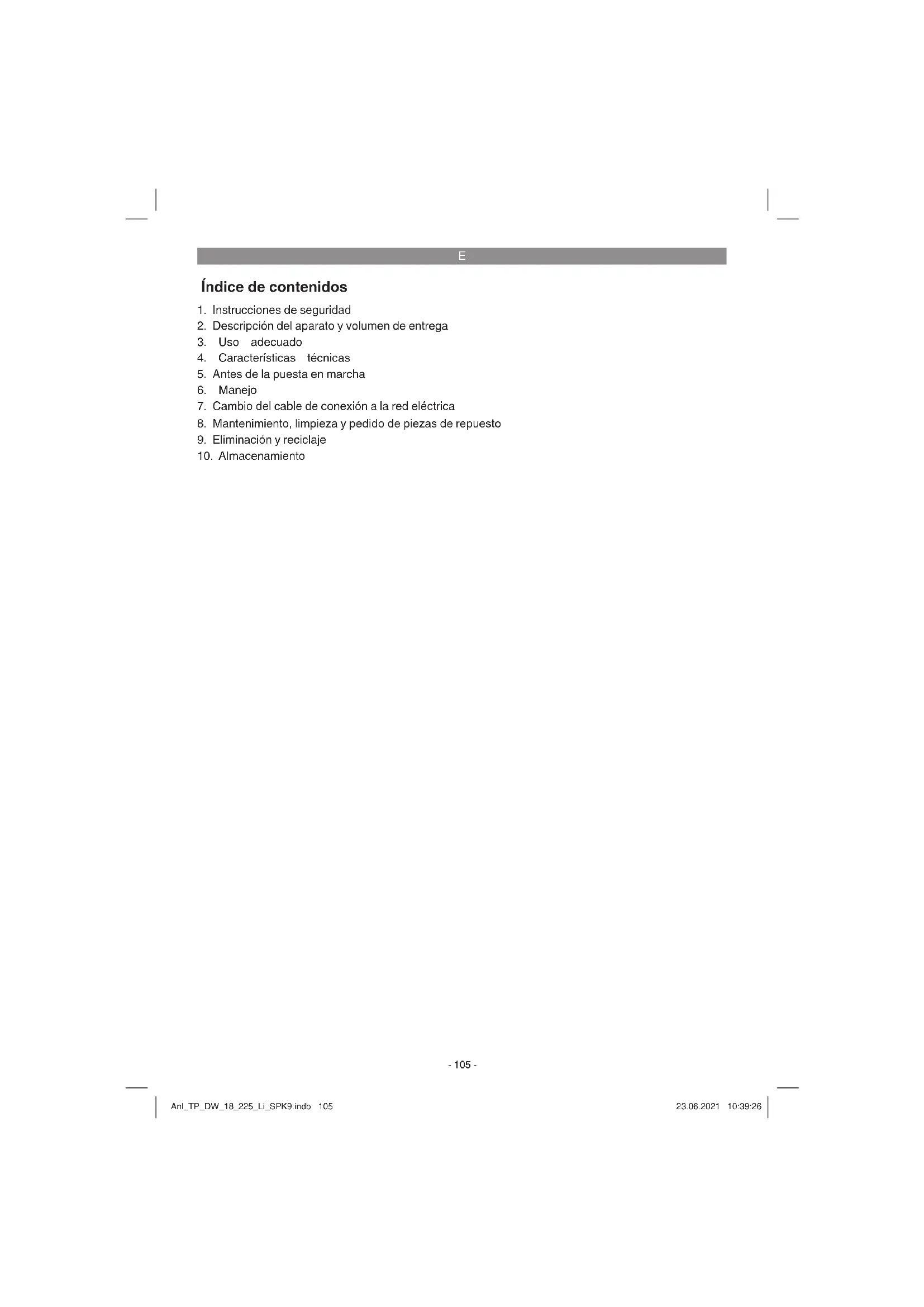 Sólo para países miembros de la UE No tirar herramientas eléctricas en la basura casera. Según la directiva europea 2012/19/CE sobre aparatos usados electrónicos y eléctricos y su aplicación en el derecho nacional, dichos aparatos deberán recojerse por separado y eliminarse de modo ecológi- co para facilitar su posterior reciclaje. Alternativa de reciclaje en caso de devolución: El propietario del aparato eléctrico, en caso de no optar por su devolución, está obligado a reciclar ade- cuadamente dicho aparato eléctrico. Para ello, también se puede entregar el aparato usado a un centro de reciclaje que trate la eliminación de residuos respetando la legislación nacional sobre residuos y su reciclaje. Esto no afecta a los medios auxiliares ni a los accesorios sin componentes eléctricos que acompañan a los aparatos usados. Sólo está permitido copiar la documentación y documentos anexos del producto, o extractos de los mismos, con autorización expresa de Einhell Germany AG. Nos reservamos el derecho a realizar modifi caciones técnicas Anl_TP_DW_18_225_Li_SPK9.indb 113Anl_TP_DW_18_225_Li_SPK9.indb 113 23.06.2021 10:39:2723.06.2021 10:39:27E