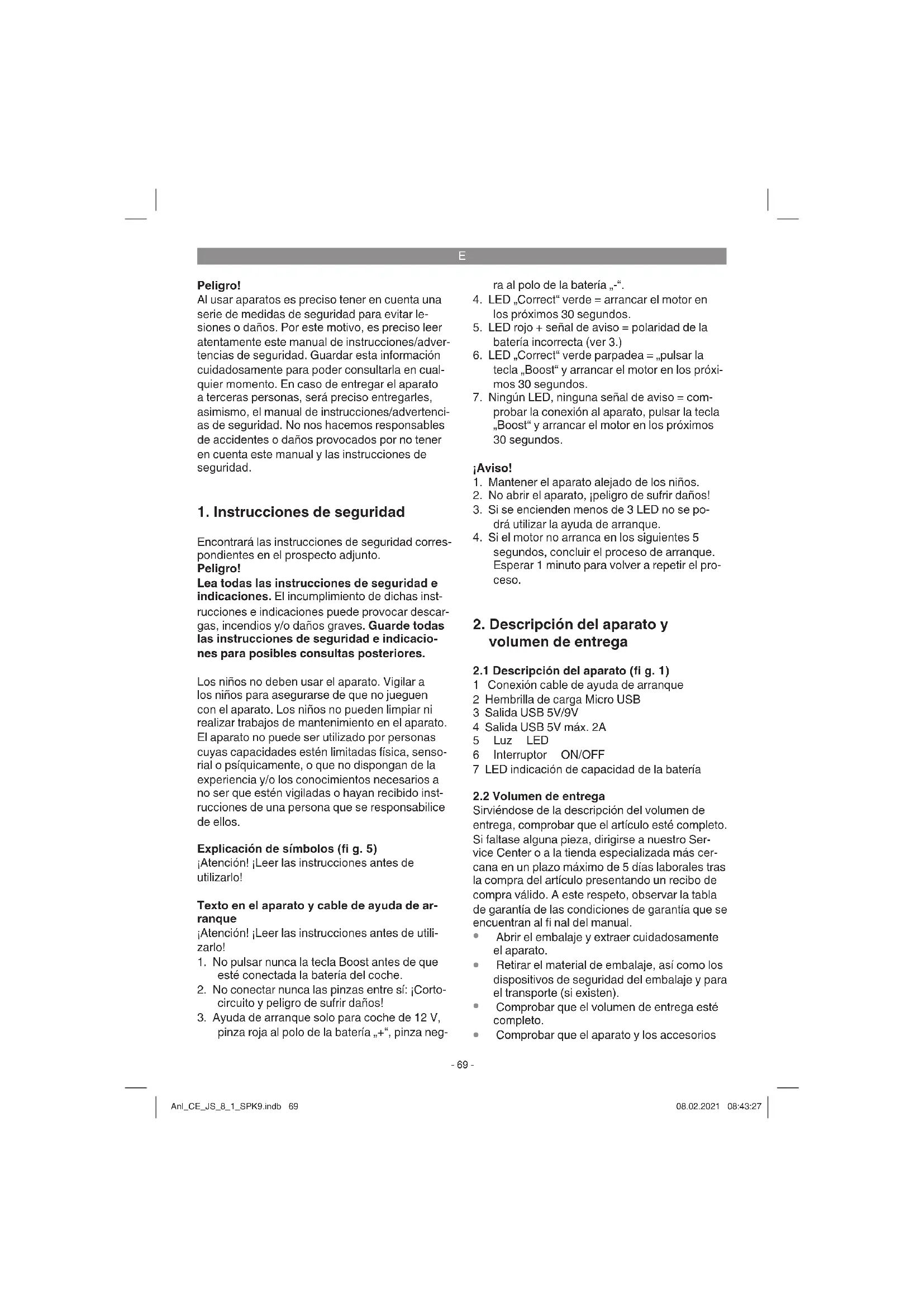 Encontrará las instrucciones de seguridad corres- pondientes en el prospecto adjunto. Peligro! Lea todas las instrucciones de seguridad e indicaciones. El incumplimiento de dichas inst- rucciones e indicaciones puede provocar descar- gas, incendios y/o daños graves. Guarde todas las instrucciones de seguridad e indicacio- nes para posibles consultas posteriores. Los niños no deben usar el aparato. Vigilar a los niños para asegurarse de que no jueguen con el aparato. Los niños no pueden limpiar ni realizar trabajos de mantenimiento en el aparato. El aparato no puede ser utilizado por personas cuyas capacidades estén limitadas física, senso- rial o psíquicamente, o que no dispongan de la experiencia y/o los conocimientos necesarios a no ser que estén vigiladas o hayan recibido inst- rucciones de una persona que se responsabilice de ellos. Explicación de símbolos (fi g. 5) ¡Atención! ¡Leer las instrucciones antes de utilizarlo! Texto en el aparato y cable de ayuda de ar- ranque ¡Atención! ¡Leer las instrucciones antes de utili- zarlo!