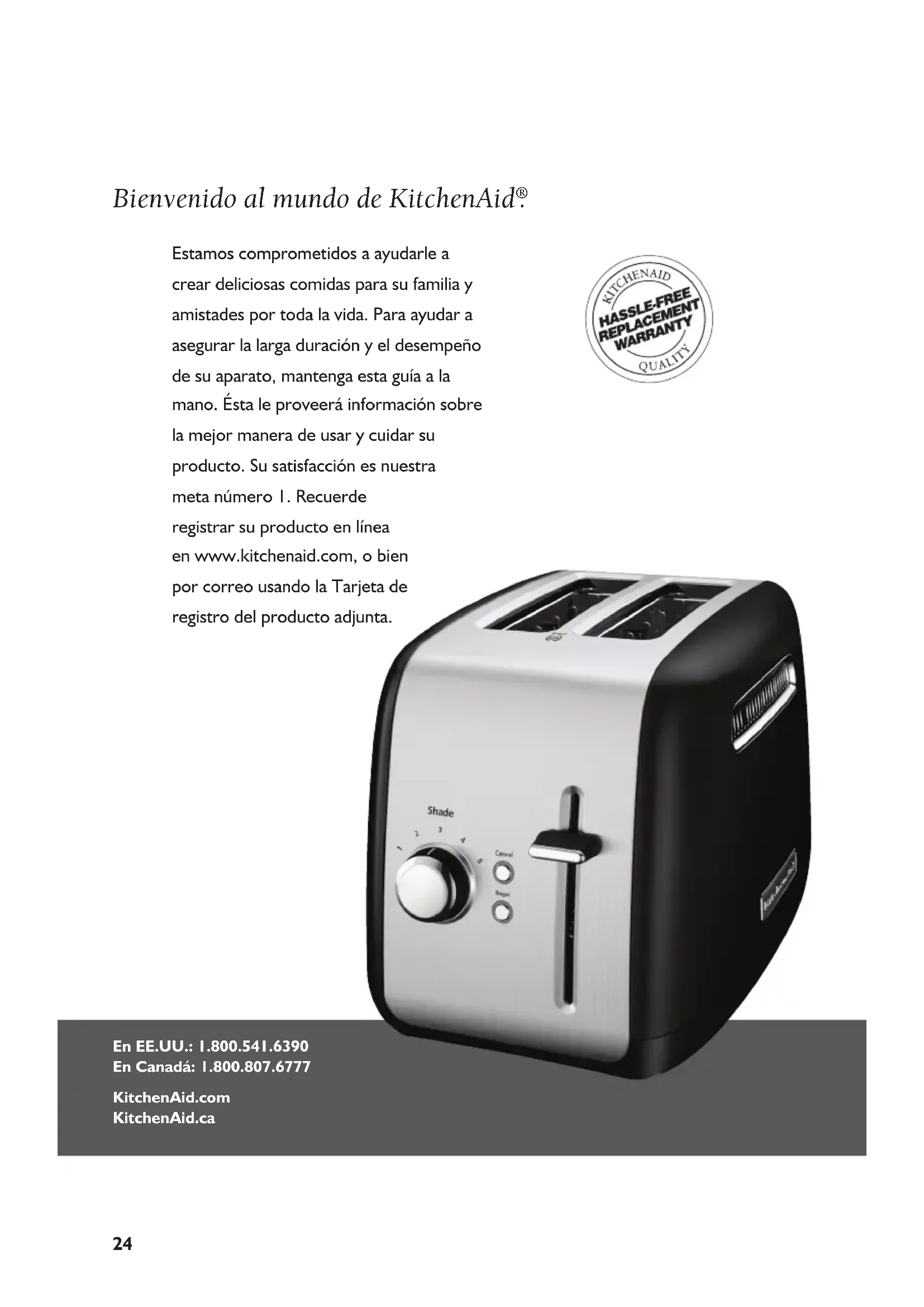Estamos comprometidos a ayudarle a crear deliciosas comidas para su familia y amistades por toda la vida. Para ayudar a asegurar la larga duración y el desempeño de su aparato, mantenga esta guía a la mano. Ésta le proveerá información sobre la mejor manera de usar y cuidar su producto. Su satisfacción es nuestra meta número 1. Recuerde registrar su producto en línea en www.kitchenaid.com, o bien por correo usando la Tarjeta de registro del producto adjunta. En EE.UU.: 1.800.541.6390 En Canadá: 1.800.807.6777 KitchenAid.com KitchenAid.ca W10441000A P1.5 Toaster.indd 24 10/7/11 3:50 PM25 Español Índice