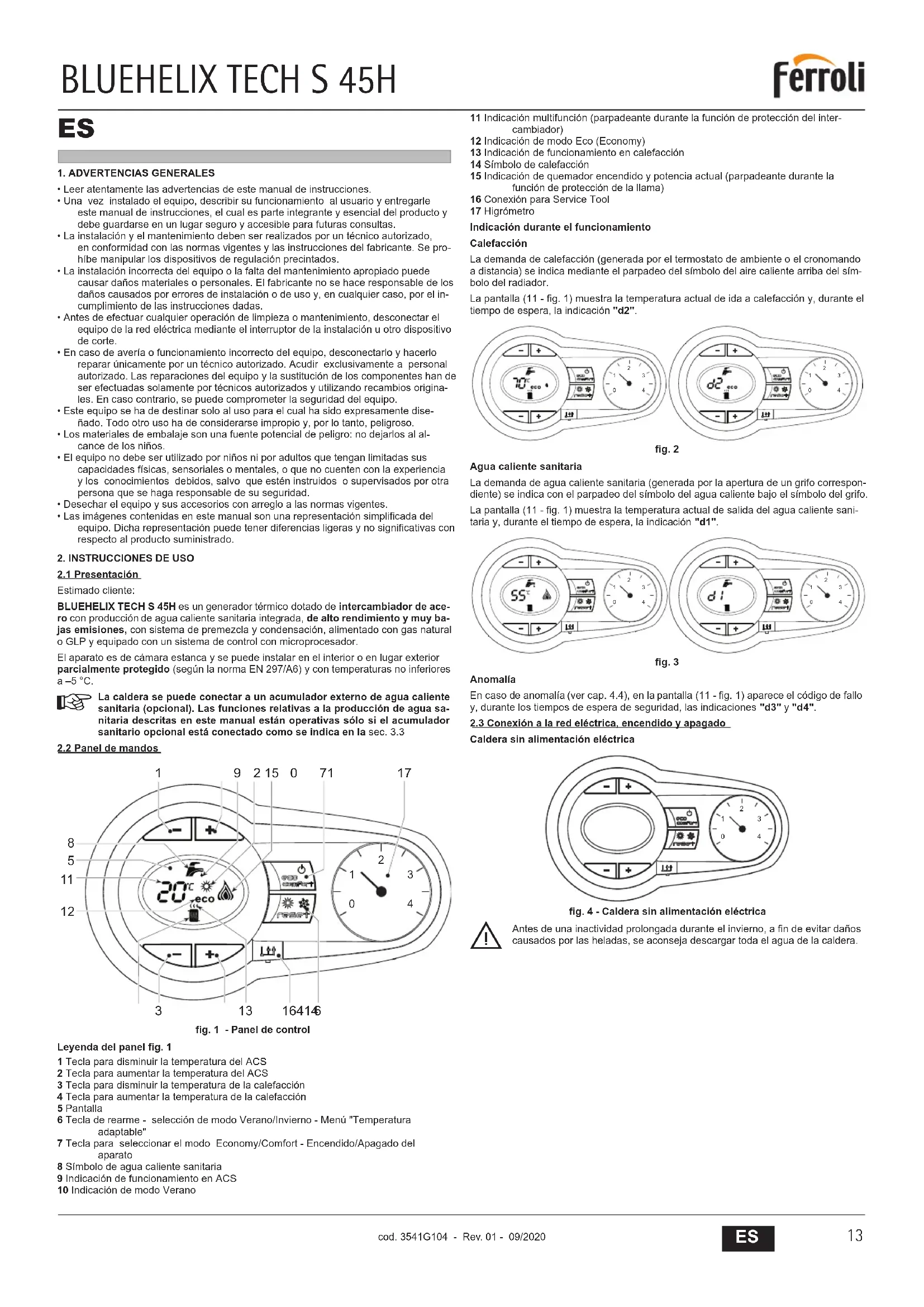 1 = Tecla para disminuir la temperatura del ACS 2 = Tecla para aumentar la temperatura del ACS 3 = Tecla para disminuir la temperatura de calefacción 4 = Tecla para aumentar la temperatura de calefacción 5 = Pantalla 6 = Tecla de selección del modo Verano /Invierno 7 = Tecla de selección del modo Economy /Comfort 8 = Tecla de rearme (reset) 9 = Tecla para encender/apagar el aparato 10 = Tecla menú “Temperatura adaptable” 11 = Indicación de que se ha alcanzado la temperatura programada del ACS 12 = Símbolo de agua caliente sanitaria 13 = Indicación de funcionamiento en ACS 14 = Ajuste / temperatura de salida ACS 15 = Indicación de modo Eco (Economy) o Comfort 16 = Temperatura sensor exterior (con sonda exterior opcional) 17 = Aparece cuando se conecta la sonda exterior o el reloj programador a distancia (opcionales). 18 = Temperatura ambiente (con reloj programador a distancia opcional) 19 = Indicación de quemador encendido 20 = Indicación de funcionamiento antihielo 21 = Indicación de presión de la instalación de calefacción 22 = Indicación de anomalía 23 = Ajuste / temperatura de ida a calefacción 24 = Símbolo de calefacción 25 = Indicación de funcionamiento en calefacción 26 = Indicación de que se ha alcanzado la temperatura programada de ida a calefacción 27 = Indicación de modo Verano Indicación durante el funcionamientoCalefacción La demanda de calefacción (generada por el termostato de ambiente o el reloj programador a distancia) se indica mediante el parpadeo del símbolo de aire caliente arriba del símbolo del radiador (24 y 25 - g. 1). Las marcas de graduación de la calefacción (26 - g. 1) se encienden en secuencia a medida que la temperatura de calefacción va alcanzando el valor programado. Esta garantía es válida para los equipos destinados a ser comercializados, vendidos e instalados sólo en el territorio español FÉRROLI ESPAÑA, S.L.U. garantiza las calderas y quemadores que suministra de acuerdo con la Real Decreto Legislativo 1/2007 de 16 de noviembre, por el que se aprueba el texto refundido de la Ley General para la Defensa de los Consumidores y Usuarios y otras leyes complementarias.El período de garantía de dos años indicado en dicho R.D. comenzará a contar desde la Puesta en Servicio por nuestro Servicio Técnico Ocial o, en su defecto, a partir de la fecha de compra. Dicha garantía tiene validez solo y exclusivamente para las calderas y quemadores vendidos e instalados en el territorio español.GARANTÍA COMERCIAL Adicionalmente FÉRROLI ESPAÑA, S.L.U. garantiza en las condiciones y plazos que se indican, la sustitución sin cargo de los componentes, siendo por cuenta del usuario la mano de obra y el desplazamiento:- Cuerpo de las calderas de chapa: Un año (no incluye mano de obra ni desplazamiento). - Cuerpo de las calderas de hierro fundido: Un año cada elemento (no incluye mano de obra ni desplazamiento). - Cuerpo de cobre de las calderas murales: Un año (no incluye mano de obra ni desplazamiento).- Acumuladores de los grupos térmicos (montados en calderas): Tres años (no incluye mano de obra ni desplazamiento).Esta garantía comercial es válida siempre que se realicen las operaciones normales de mantenimiento descritas en las instrucciones técnicas suministradas con los equipos.La garantía no cubre las incidencias producidas por:- Transporte no efectuado a cargo de la empresa. - Manipulación del producto por personal ajeno a FÉRROLI ESPAÑA, S.L.U. durante el período de garantía. - Si el montaje no respeta las instrucciones que se suministran en la máquina. - La instalación de la máquina no respeta las Leyes y Reglamentaciones en vigor (electricidad, hidráulicas, combustibles, etc.). - Defectos de instalación hidráulica, eléctrica, alimentación de combustible, de evacuación de los productos de la combus- tión, chimeneas y desagües.- Anomalías por incorrecto tratamiento del agua de alimentación, por tratamiento desincrustante mal realizado, etc.- Anomalías causadas por condensaciones. - Anomalías por agentes atmosféricos (hielos, rayos, inundaciones, etc.) así como por corrientes erráticas.- Corrosiones por causas de almacenamiento inadecuado.El material sustituido en garantía quedará en propiedad de FÉRROLI ESPAÑA, S.L.U. NOTA: Es imprescindible la cumplimentación de la totalidad de los datos en el Certicado de Funcionamiento. Las posibles reclamaciones deberán efectuarse ante el organismo competente en esta materia. Sede Central y Fábrica: Polígono Industrial de Villayuda Apartado de Correos 267 - 09007 Burgos Tel. 947 48 32 50 Fax 947 48 56 72 e.mail: ferroli@ferroli.es http//www.ferroli.es Dirección Comercial: Avda. Italia, 2 28820 Coslada (Madrid) Tel. 91 661 23 04 Fax 91 661 09 91 e.mail: marketing@ferroli.es Jefaturas Regionales de Ventas CENTRO Tel.: 91 661 23 04 - Fax: 91 661 09 73 e.mail: madrid@ferroli.es CENTRO – NORTE Tel.: 94 748 32 50 - Fax: 94 748 56 72 e.mail: burgos@ferroli.es NOROESTE Tel.: 98 179 50 47 - Fax: 98 179 57 34 e.mail: coruna@ferroli.es LEVANTE – CANARIAS Tel.: 96 378 44 26 - Fax: 96 139 12 26 e.mail: levante@ferroli.es NORTE Tel.: 94 748 32 50 - Fax: 94 748 56 72 e.mail: jrnorte@ferroli.es CATALUÑA – BALEARES Tel.: 93 729 08 64 - Fax: 93 729 12 55 e.mail: barna@ferroli.es ANDALUCIA Tel.: 95 560 03 12 - Fax: 95 418 17 76 e.mail: sevilla@ferroli.es Certicado de garantía Certicado de garantía Certicado de garantía Certi Certicado de garantía Certicado de garantía Certicado de garantía Certi Certificado de garantía Certicado de garantía Rellene el cupón incluido Sede Central y Fábrica: Dirección Comercial: Jefaturas Regionales de VentasBLUEHELIX TECH S 45H