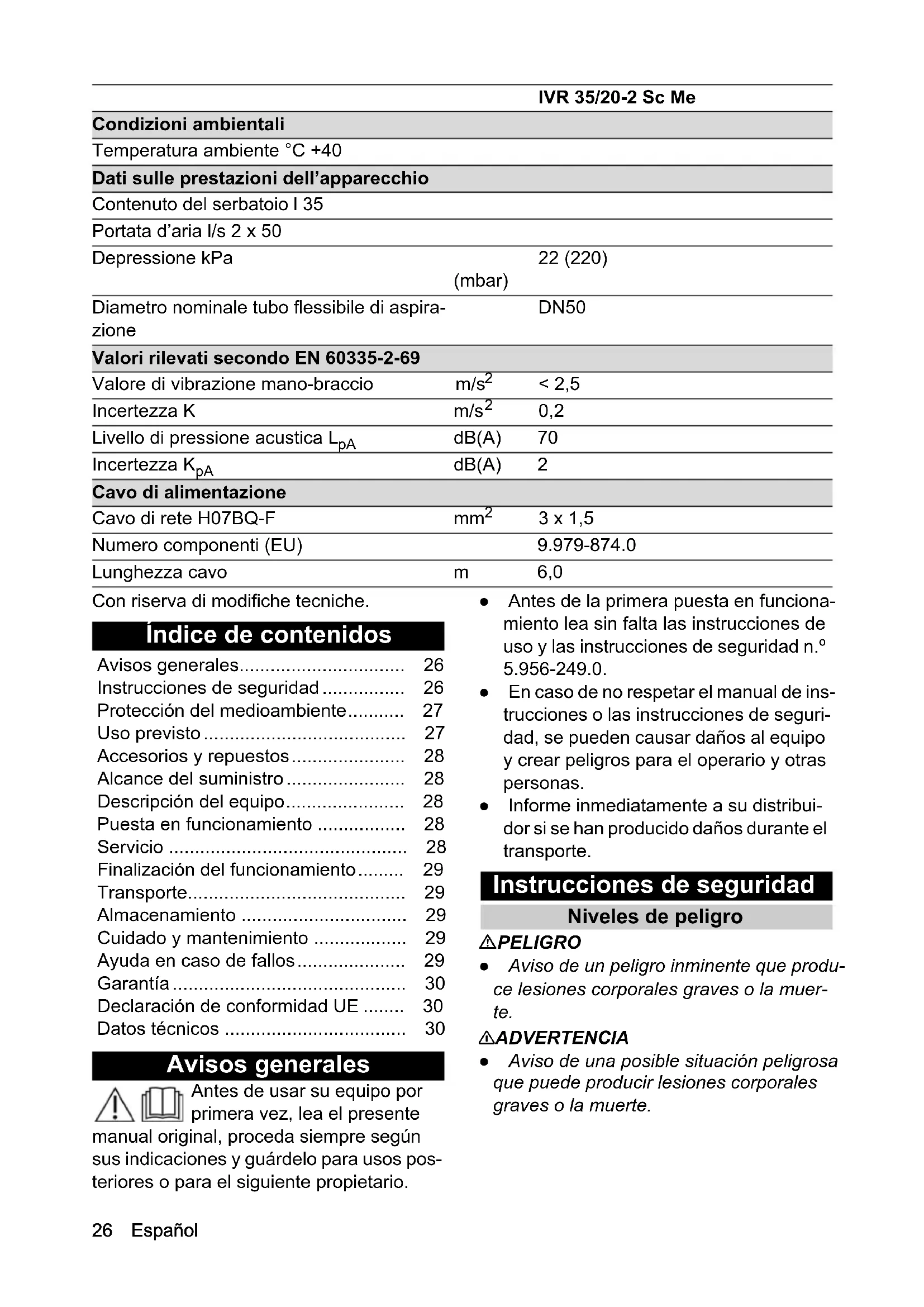 - 3 x 1,5 Numero componenti (EU) 9.979-874.0 Lunghezza cavo m 6,0 IVR 35/20-2 Sc Me Avisos generales p. 26