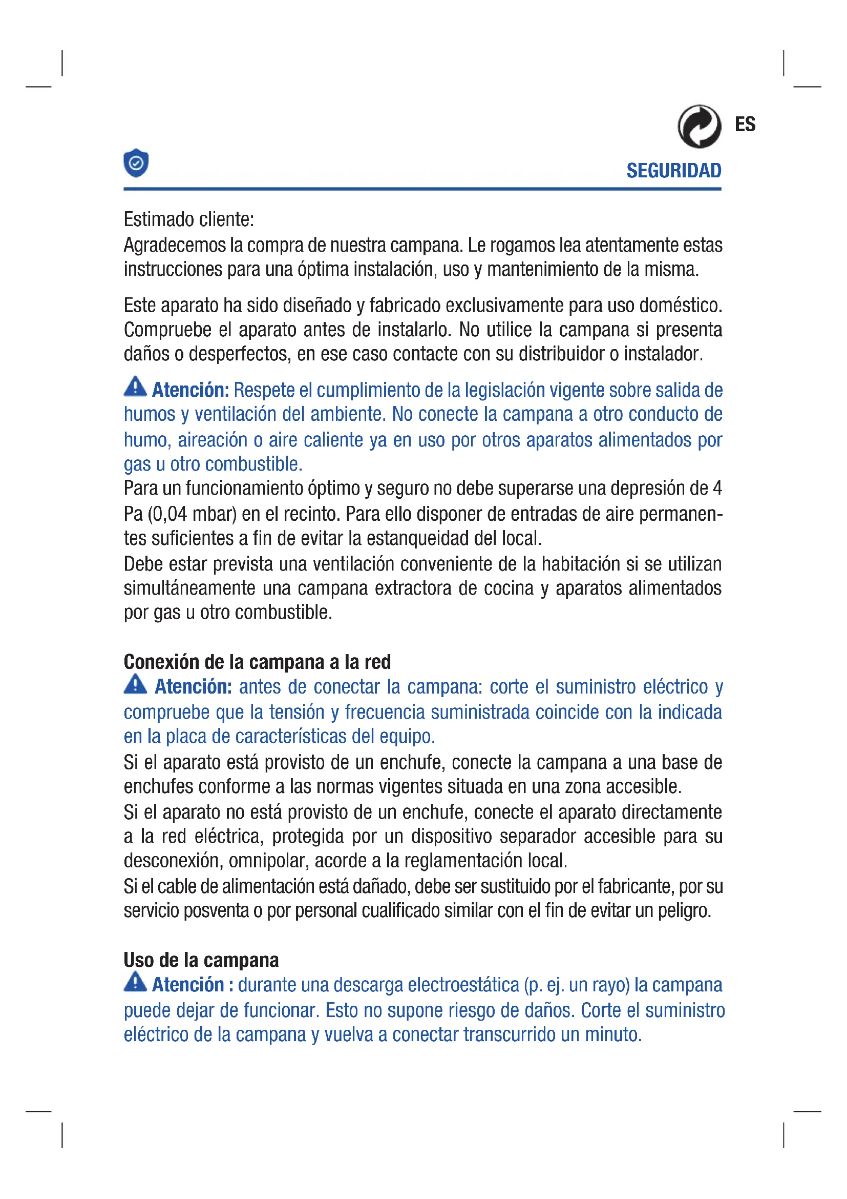 - Coloque de nuevo las rejillas. Sólo para aparatos de cocción a gas: La distancia mínima hasta la campana debe ser como mínimo 65 cms. USO Este aparato extae los humos de la cocina para eliminar olores y mantener la calidad y nivel optimo de aire en la habitación. El aparato tambien permite iluminar el area de cocinado.ES