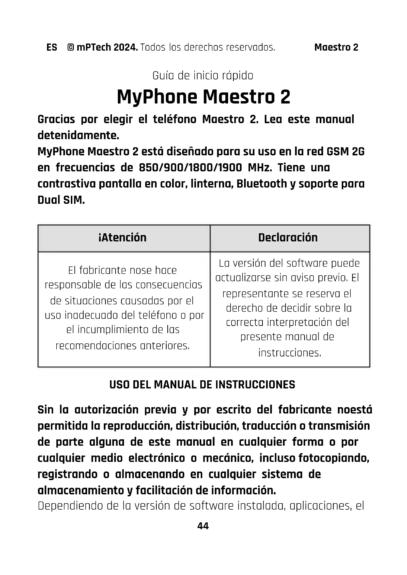 Guía de inicio rápido MyPhone Maestro 2 Gracias por elegir el teléfono Maestro 2. Lea este manual detenidamente. MyPhone Maestro 2 está diseñado para su uso en la red GSM 2G en frecuencias de 850/900/1800/1900 MHz. Tiene una contrastiva pantalla en color, linterna, Bluetooth y soporte para Dual SIM. ¡Atención Declaración El fabricante nose hace responsable de las consecuencias de situaciones causadas por el uso inadecuado del teléfono o por el incumplimiento de las recomendaciones anteriores. La versión del software puede actualizarse sin aviso previo. El representante se reserva el derecho de decidir sobre la correcta interpretación del presente manual de instrucciones.