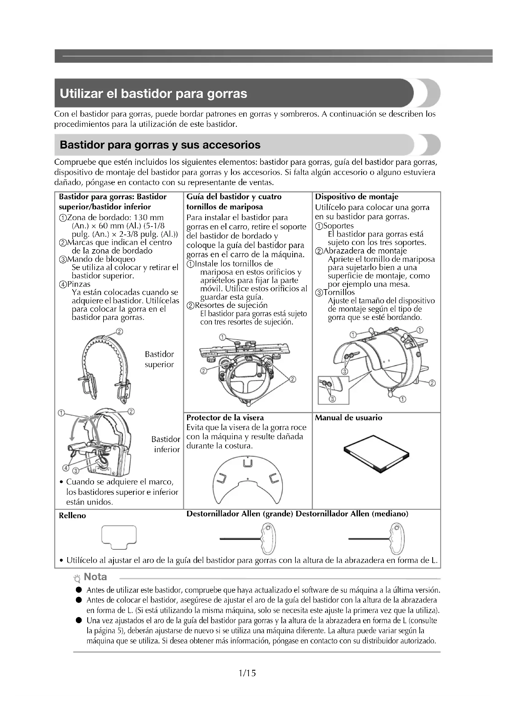 - Si existe espacio suficiente entre la visera de la gorra y la máquina, puede coserse sin el protector de la visera.12/15 ESPAÑOL Nota
