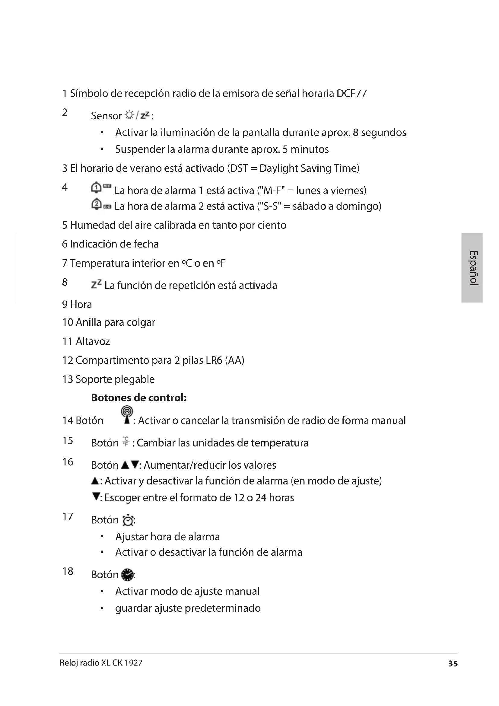 Reloj radio XL CK 1927 Español La emisora está en Mainflingen, junto a Frankfurt am Main y, con un alcance de 2.000 km, hace llegar las señales de radio a la mayoría de los relojes radio controlados de Europa occidental. En cuanto el reloj recibe alimentación, se conecta el receptor y busca la señal del emisor DCF77. Si la señal horaria se recibe con la fuerza suficiente, se mostrará en la pantalla la fecha, la hora y el día. El reloj radio controlado se conecta varias veces diariamente y sincroniza la hora con la señal radio del emisor DCF77. En caso de no recibirse la señal, por ejemplo por una tormenta intensa, el aparato sigue funcionando con precisión y se vuelve a conectar nuevamente en la siguiente hora prevista. Despertador El dispositivo ofrece la posibilidad de ajustar dos horas de alarma independientes la una de la otra. En ambas se puede establecer en qué días de la semana estarán activas: lunes a viernes ("M-F"), sábado a domingo ("S-S") o lunes a domingo ("M-S"). Ajustar hora de alarma Cuando pasan más de 20 segundos entre una pulsación de botón y otra, el proceso de ajuste naliza automáticamente y hay que volver a repetirlo. Si mantiene pulsado o , el valor avanzará o retrocederá más rápido. Ambas horas de alarma se ajustan de la misma manera.