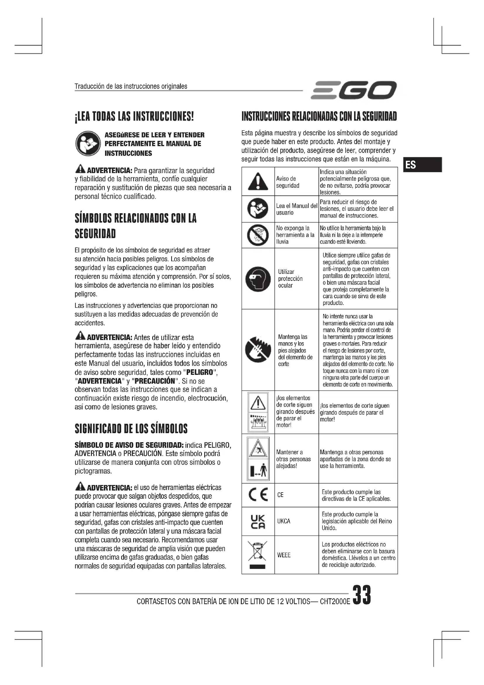 Esta página muestra y describe los símbolos de seguridad que puede haber en este producto. Antes del montaje y utilización del producto, asegúrese de leer, comprender y seguir todas las instrucciones que están en la máquina. Aviso de seguridadIndica una situación potencialmente peligrosa que, de no evitarse, podría provocar lesiones.Lea el Manual del usuarioPara reducir el riesgo de lesiones, el usuario debe leer el manual de instrucciones.No exponga la herramienta a la lluviaNo utilice la herramienta bajo la lluvia ni la deje a la intemperie cuando esté lloviendo.Utilizar protección ocularUtilice siempre utilice gafas de seguridad, gafas con cristales anti-impacto que cuenten con pantallas de protección lateral, o bien una máscara facial que proteja completamente la cara cuando se sirva de este producto.Mantenga las manos y los pies alejados del elemento de corteNo intente nunca usar la herramienta eléctrica con una sola mano. Podría perder el control de la herramienta y provocar lesiones graves o mortales. Para reducir el riesgo de lesiones por corte, mantenga las manos y los pies alejados del elemento de corte. No toque nunca con la mano ni con ninguna otra parte del cuerpo un elemento de corte en movimiento.¡los elementos de corte siguen girando después de parar el motor!¡los elementos de corte siguen girando después de parar el motor!Mantener a otras personas alejadas!Mantenga a otras personas apartadas de la zona donde se use la herramienta. Este producto cumple las directivas de la CE aplicables. UKCA Este producto cumple la legislación aplicable del Reino Unido. WEEE Los productos eléctricos no deben eliminarse con la basura doméstica. Llévelos a un centro de reciclaje autorizado. Traducción de las instrucciones originalesCORTASETOS CON BATERÍA DE ION DE LITIO DE 12 VOLTIOS— CHT2000E34