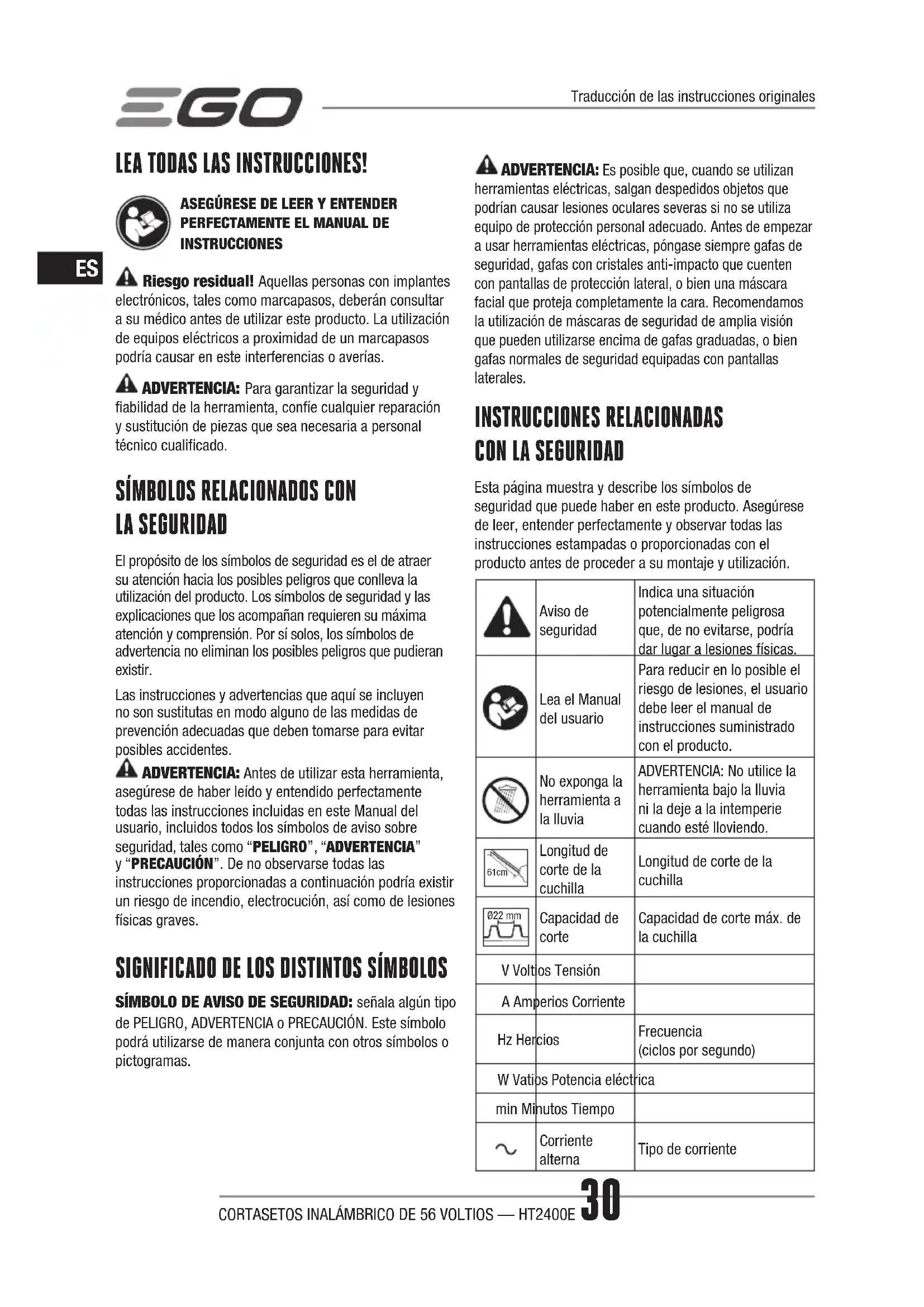 Esta página muestra y describe los símbolos de seguridad que puede haber en este producto. Asegúrese de leer, entender perfectamente y observar todas las instrucciones estampadas o proporcionadas con el producto antes de proceder a su montaje y utilización.Aviso de seguridadIndica una situación potencialmente peligrosa que, de no evitarse, podría dar lugar a lesiones físicas.Lea el Manual del usuarioPara reducir en lo posible el riesgo de lesiones, el usuario debe leer el manual de instrucciones suministrado con el producto.No exponga la herramienta a la lluviaADVERTENCIA: No utilice la herramienta bajo la lluvia ni la deje a la intemperie cuando esté lloviendo. 61cm Longitud de corte de la cuchillaLongitud de corte de la cuchillaØ22 mmCapacidad de corteCapacidad de corte máx. de la cuchillaV Voltios TensiónA Amperios CorrienteHz HerciosFrecuencia (ciclos por segundo)W Vatios Potencia eléctricamin Minutos TiempoCorriente alternaTipo de corrienteTraducción de las instrucciones originalesCORTASETOS INALÁMBRICO DE 56 VOLTIOS — HT2400E