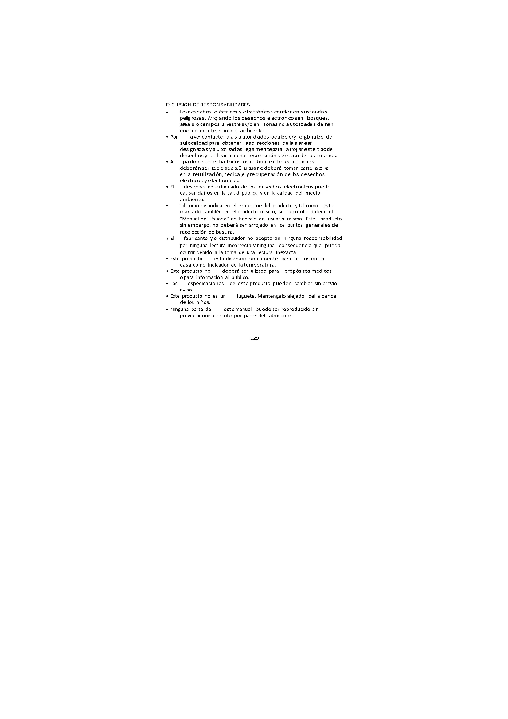 fabricante y el distribuidor no aceptaran ninguna responsabilidad por ninguna lectura incorrecta y ninguna consecuencia que pueda ocurrir debido a la toma de una lectura inexacta.