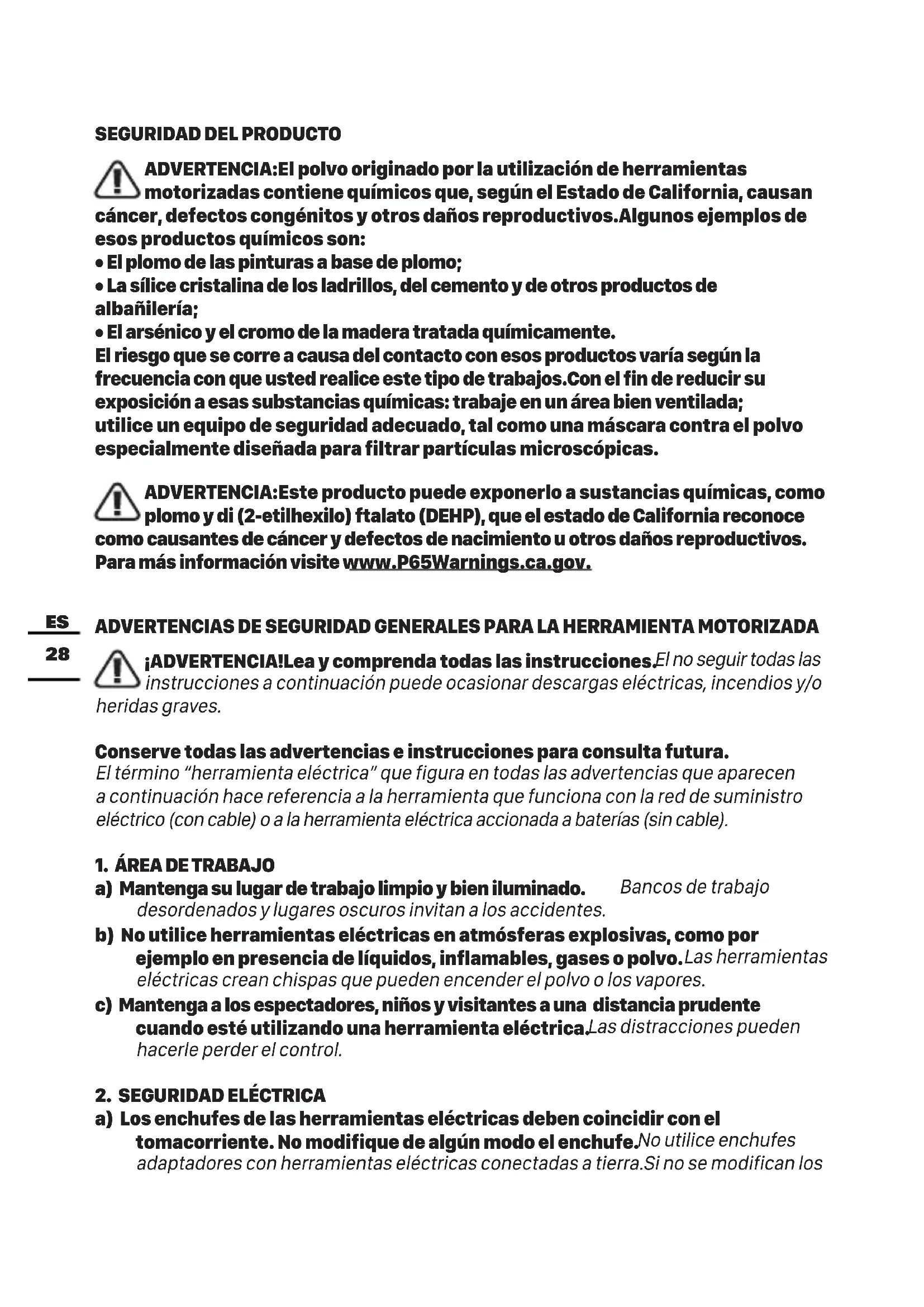 - El arsénico y el cromo de la madera tratada químicamente. El riesgo que se corre a causa del contacto con esos productos varía según la frecuencia con que usted realice este tipo de trabajos.Con el fin de reducir su exposición a esas substancias químicas: trabaje en un área bien ventilada; utilice un equipo de seguridad adecuado, tal como una máscara contra el polvo especialmente diseñada para filtrar partículas microscópicas. ADVERTENCIA:Este producto puede exponerlo a sustancias químicas, como plomo y di (2-etilhexilo) ftalato (DEHP), que el estado de California reconoce como causantes de cáncer y defectos de nacimiento u otros daños reproductivos. Para más información visite www.P65Warnings.ca.gov. ADVERTENCIAS DE SEGURIDAD GENERALES PARA LA HERRAMIENTA MOTORIZADA ¡ADVERTENCIA!Lea y comprenda todas las instrucciones. El no seguir todas las instrucciones a continuación puede ocasionar descargas eléctricas, incendios y/o heridas graves. Conserve todas las advertencias e instrucciones para consulta futura. El término “herramienta eléctrica” que figura en todas las advertencias que aparecen a continuación hace referencia a la herramienta que funciona con la red de suministro eléctrico (con cable) o a la herramienta eléctrica accionada a baterías (sin cable).