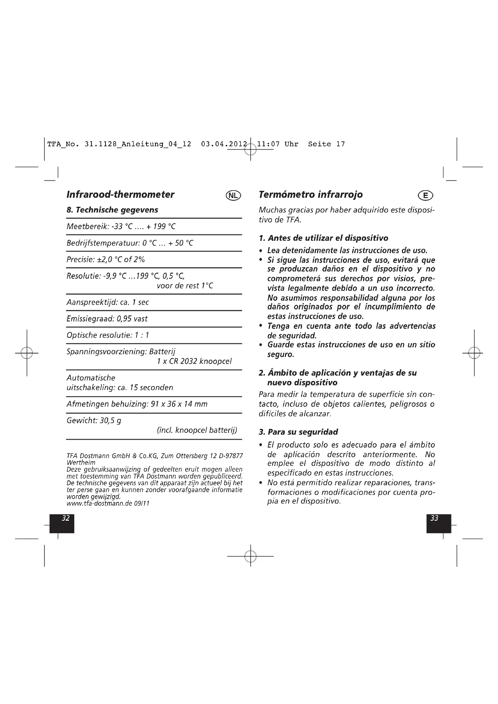 Gama de medición: -33 °C …. + 199 °C Temperatura de servicio: 0 °C … + 50 °C Precisión: ±2,0 °C o 2% Resolución de -9,9 °C …199°C, 0,5 °C, la pantalla: si no 1°C Tiempo de reacción: hasta 1 segundo Grado de emisión: 0,95 solido Resolución óptica: 1 : 1 Alimentación de tensión: 1 x CR 2032 pila de botón Desconexión automática: después de 15 segundos Dimensiones: 91 x 36 x 14 mm Peso: 30,5 g (pila de botón incluida) TFA Dostmann GmbH & Co.KG, Zum Ottersberg 12, D-97877 Wertheim Estas instrucciones o extractos de las mismas no pueden ser publicados sin la autorización de la TFA Dostmann. Los datos técnicos de este producto corresponden al estado en el momento de la impresión y pueden ser modificados sin previo aviso. www.tfa-dostmann.de 09/11 Infrarot-Thermometer
