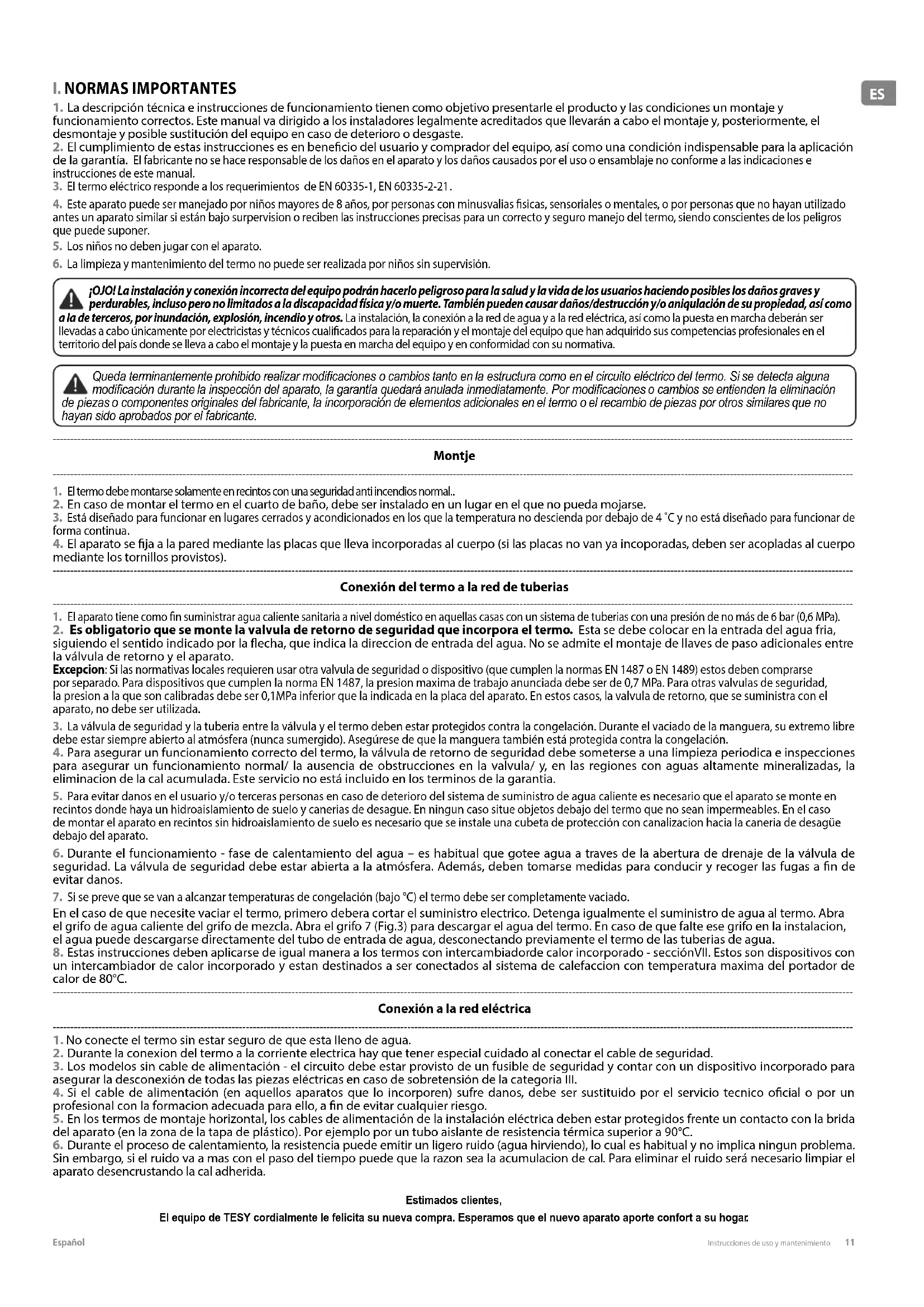 2. Durante la conexion del termo a la corriente electrica hay que tener especial cuidado al conectar el cable de seguridad. 3. Los modelos sin cable de alimentaciόn - el circuito debe estar provisto de un fusible de seguridad y contar con un dispositivo incorporado para asegurar la desconexión de todas las piezas eléctricas en caso de sobretensión de la categoria III. 4. Si el cable de alimentación (en aquellos aparatos que lo incorporen) sufre danos, debe ser sustituido por el servicio tecnico ocial o por un profesional con la formacion adecuada para ello, a n de evitar cualquier riesgo. 5. En los termos de montaje horizontal, los cables de alimentaciόn de la instalaciόn eléctrica deben estar protegidos frente un contacto con la brida del aparato (en la zona de la tapa de plástico). Por ejemplo por un tubo aislante de resistencia térmica superior a 90°C. 6. Durante el proceso de calentamiento, la resistencia puede emitir un ligero ruido (agua hirviendo), lo cual es habitual y no implica ningun problema. Sin embargo, si el ruido va a mas con el paso del tiempo puede que la razon sea la acumulacion de cal. Para eliminar el ruido será necesario limpiar el aparato desencrustando la cal adherida. Estimados clientes, El equipo de TESY cordialmente le felicita su nueva compra. Esperamos que el nuevo aparato aporte confort a su hogar .12 Instrucciones de uso y mantenimiento
