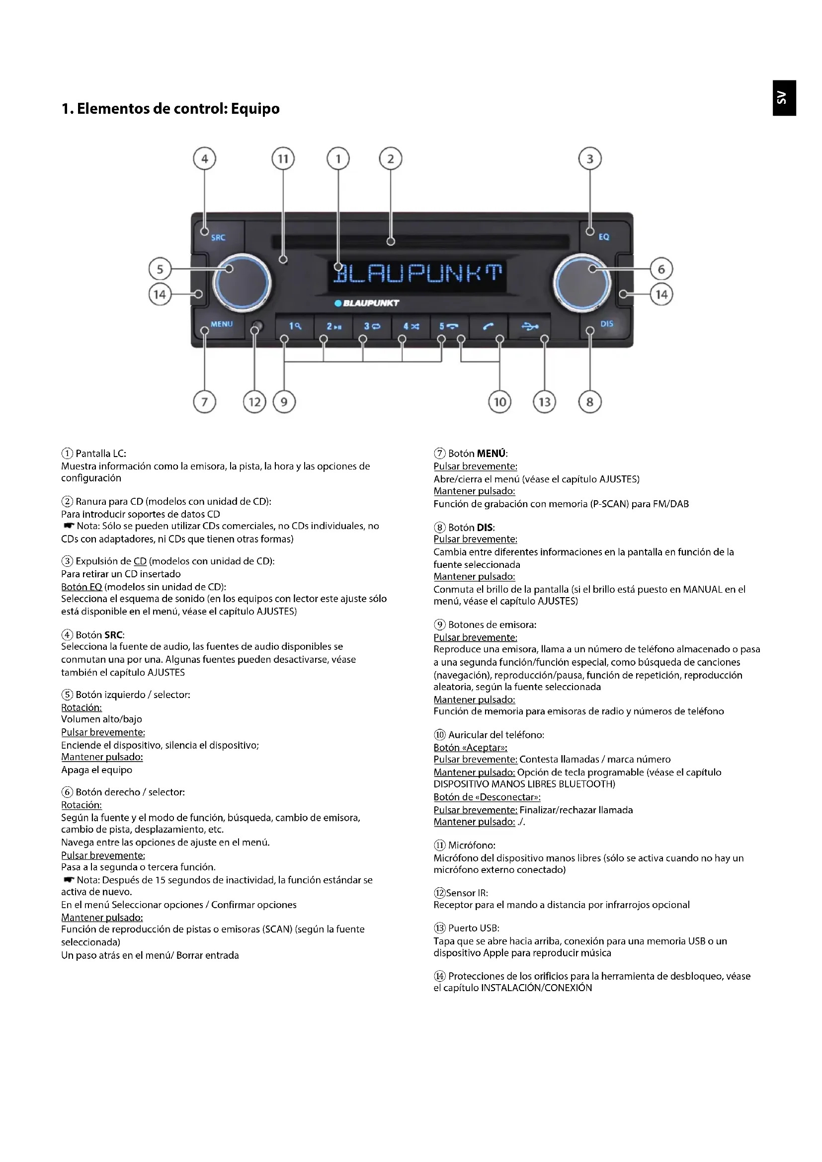 Elementos de control, equipo 1 Elementos de control, mando a distancia (accesorio opcional) 2 Enhorabuena | Índice 3 Reglas de seguridad 4 Información general | Alcance de la entrega | Actualización del software 5 Encendido/apagado | Cambio del volumen 6 Radio analógica: VHF/ ondas medias (FM/AM) 7 Radio digital: DAB/DAB+ 8 Reproducción desde dispositivos y soportes externos: Reproductor de CD (accesorio opcional) 9 Reproducción desde dispositivos y soportes externos: USB 10 Reproducción desde dispositivos y soportes externos: Bluetooth® 11 Reproducción de dispositivos externos y soportes de datos: iPod/iPhone 12 Reproducción desde dispositivos y soportes externos: AUX 13 Juego de manos libres Bluetooth® 14 Reloj 15 Mando a distancia en el volante (SWC) 16 Ajustes | Menú 17 Instalación | Desmontaje | Conexiones 18 Información útil | Datos técnicos 19 Búsqueda de errores 20ES