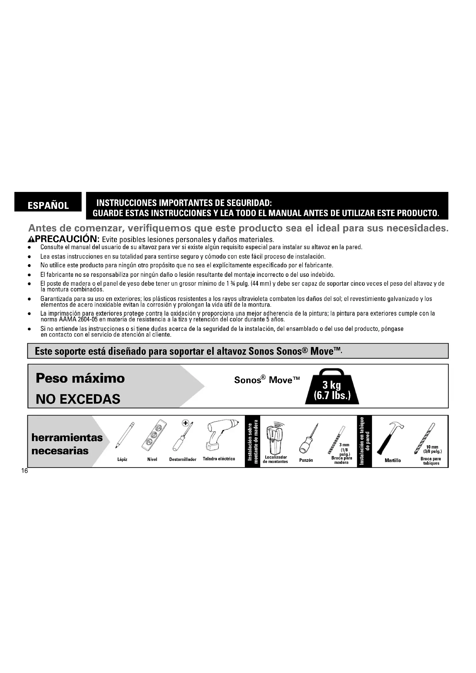 ● Consulte el manual del usuario de su altavoz para ver si existe algún requisito especial para instalar su altavoz en la pared. ● Lea estas instrucciones en su totalidad para sentirse seguro y cómodo con este fácil proceso de instalación. ● No utilice este producto para ningún otro propósito que no sea el explícitamente especificado por el fabricante. ● El fabricante no se responsabiliza por ningún daño o lesión resultante del montaje incorrecto o del uso indebido. ● El poste de madera o el panel de yeso debe tener un grosor mínimo de 1 ¾ pulg. (44 mm) y debe ser capaz de soportar cinco veces el peso del altavoz y de la montura combinados. ● Garantizada para su uso en exteriores; los plásticos resistentes a los rayos ultravioleta combaten los daños del sol; el revestimiento galvanizado y los elementos de acero inoxidable evitan la corrosión y prolongan la vida útil de la montura. ● La imprimación para exteriores protege contra la oxidación y proporciona una mejor adherencia de la pintura; la pintura para exteriores cumple con la norma AAMA 2604-05 en materia de resistencia a la tiza y retención del color durante 5 años. ● Si no entiende las instrucciones o si tiene dudas acerca de la seguridad de la instalación, del ensamblado o del uso del producto, póngase en contacto con el servicio de atención al cliente. Antes de comenzar, verifiquemos que este producto sea el ideal para sus necesidades. PRECAUCIÓN: Evite posibles lesiones personales y daños materiales. 3 kg (6.7 lbs.) Peso máximo NO EXCEDAS Sonos Move™ herramientas necesarias Instalación sobre montante de madera Punzón Lápiz Nivel Localizador de montantes Destornillador Broca para madera Taladro eléctrico 10 mm (3/8 pulg.) 3 mm (1/8 pulg.) Instalación en tabique de pared Martillo Broca para tabiques17 Dimensiones ADVERTENCIA: Este producto contiene piezas pequeñas que, en caso de ser tragadas, podrían causar asfixia. Antes de comenzar a montar la unidad, verifique que dispone de todas las piezas y que se encuentran en buen estado. Si no dispone de todas las piezas o alguna está dañada, no devuelva el elemento defectuoso al distribuidor. Póngase en contacto con el servicio de atención al cliente. Nunca utilice piezas en mal estado. NOTA: No se utilizarán todos los elementos de sujeción incluidos. Piezas y elementos de sujeción suministrados Página 4 PRECAUCIÓN: ¡Evite posibles lesiones personales o daños materiales! ● El yeso que recubre la pared no debe exceder los 12.7 mm (1/2 pulg.) ● Tamaño mínimo del montante de madera: común 51 x 102 mm (2 x 4 pulg.) nominal 38 x 89 mm (1 ½ x 3 ½ pulg.) ● Debe comprobar los montantes centrales PRECAUCIÓN: ¡Evite posibles lesiones personales o daños a la propiedad! Ambos tornillos