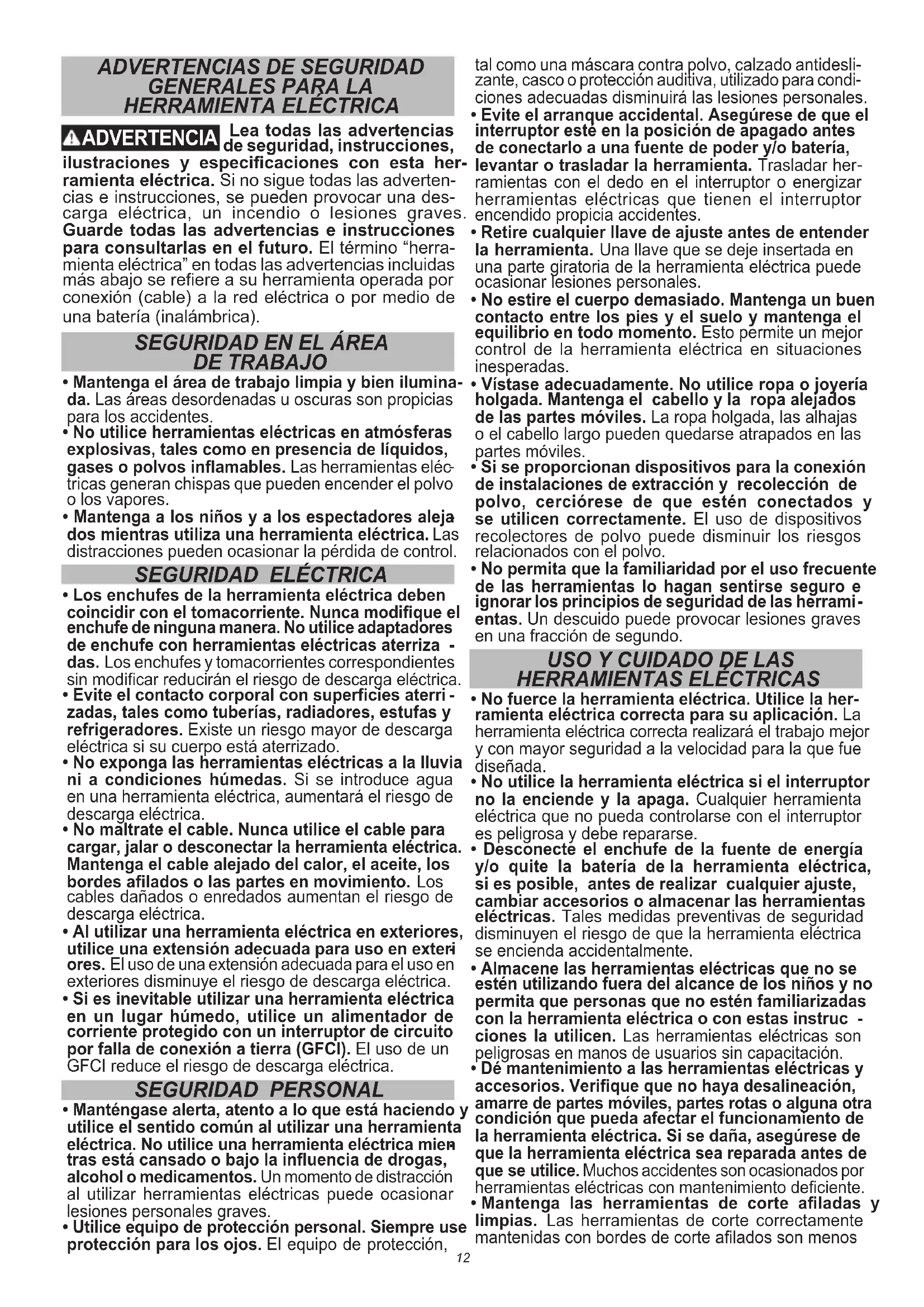 ADVERTENCIA Lea todas las advertencias de seguridad, instrucciones, ilustraciones y especicaciones con esta her- ramienta eléctrica. Si no sigue todas las adverten- cias e instrucciones, se pueden provocar una des- carga eléctrica, un incendio o lesiones graves. Guarde todas las advertencias e instrucciones para consultarlas en el futuro. El término “herra- mienta eléctrica” en todas las advertencias incluidas más abajo se reere a su herramienta operada por conexión (cable) a la red eléctrica o por medio de una batería (inalámbrica).