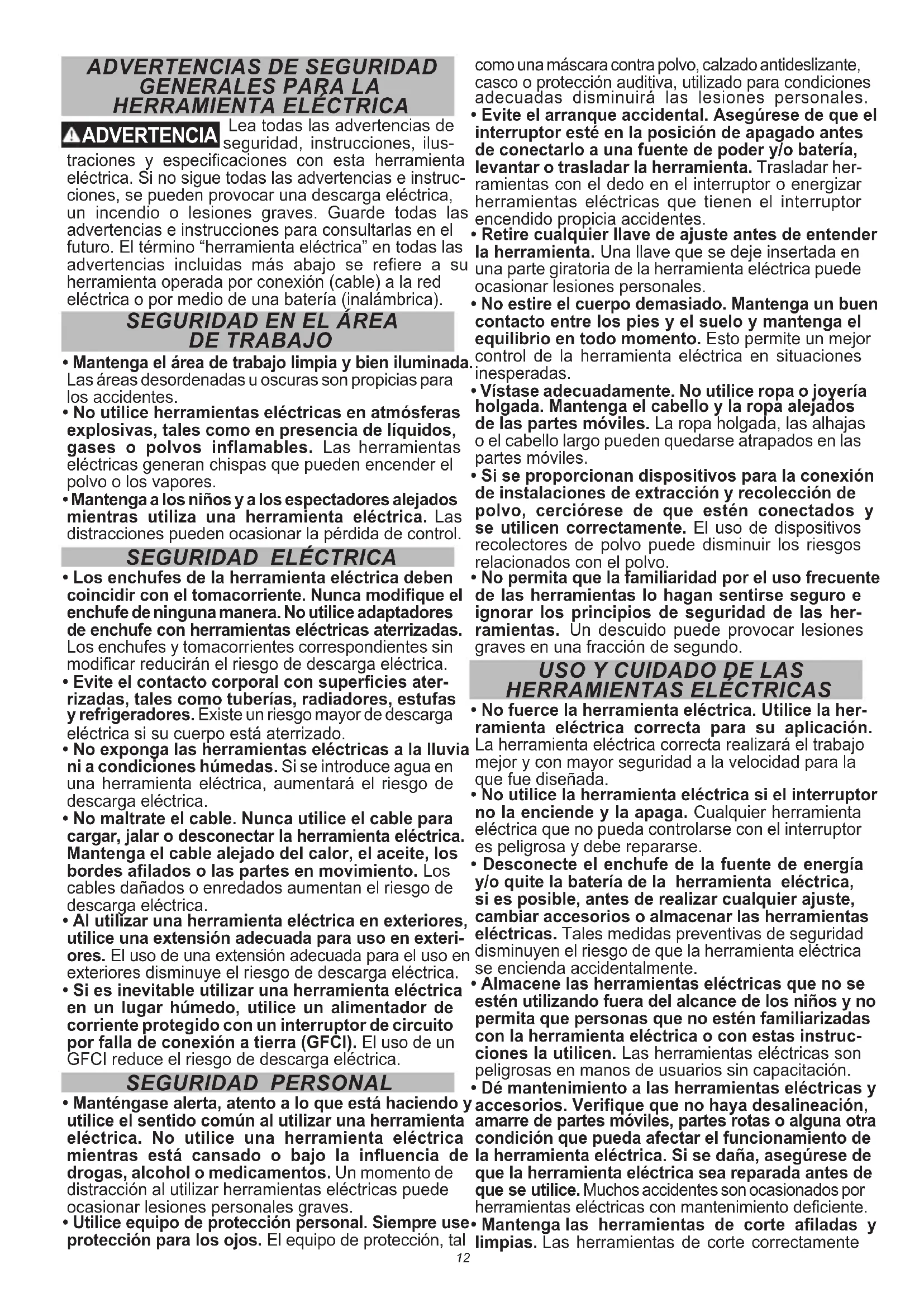 ADVERTENCIA Lea todas las advertencias de seguridad, instrucciones, ilus- traciones y especicaciones con esta herramienta eléctrica. Si no sigue todas las advertencias e instruc- ciones, se pueden provocar una descarga eléctrica, un incendio o lesiones graves. Guarde todas las advertencias e instrucciones para consultarlas en el futuro. El término “herramienta eléctrica” en todas las advertencias incluidas más abajo se reere a su herramienta operada por conexión (cable) a la red eléctrica o por medio de una batería (inalámbrica).