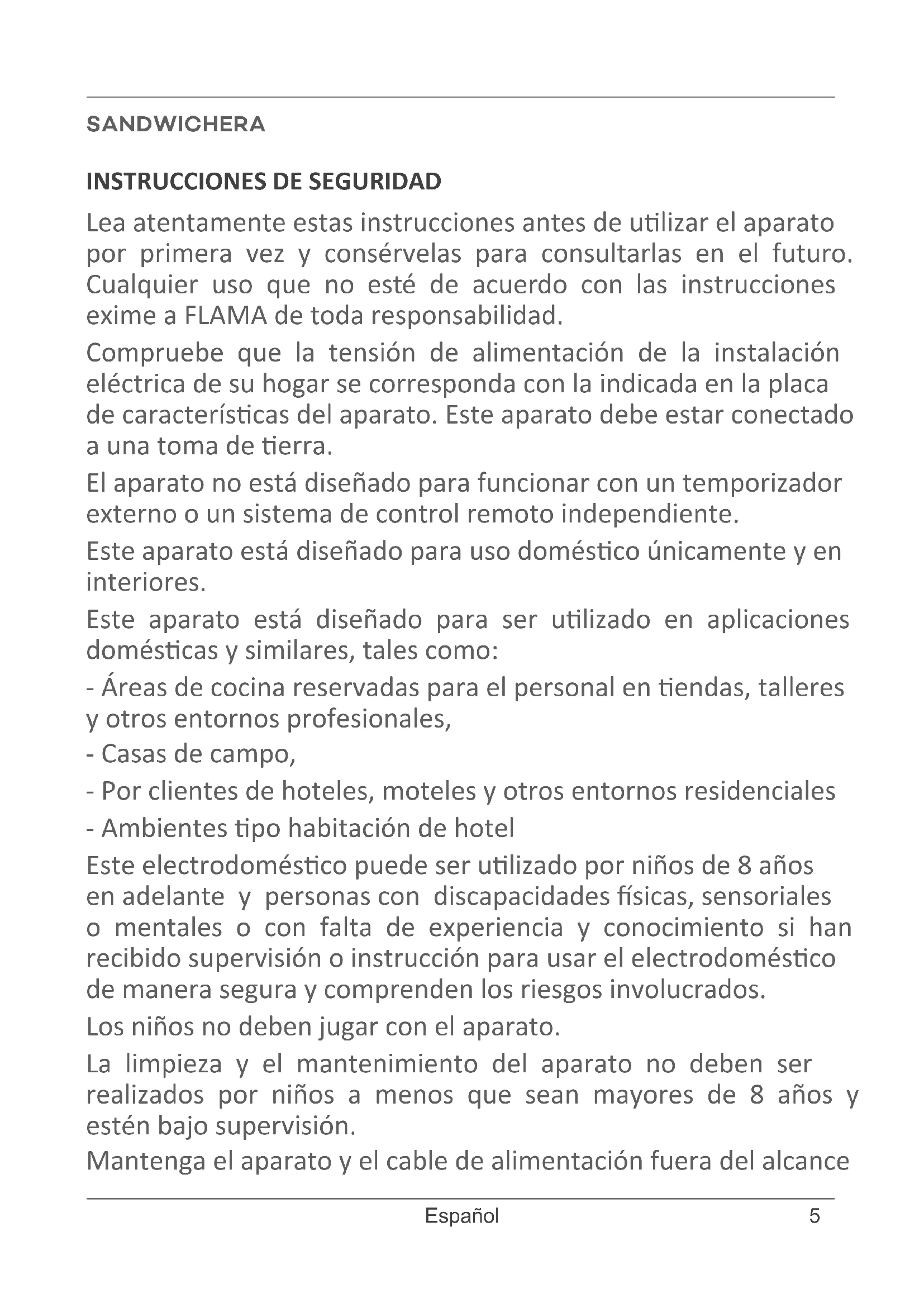 Lea atentamente estas instrucciones antes de ulizar el aparato por primera vez y consérvelas para consultarlas en el futuro. Cualquier uso que no esté de acuerdo con las instrucciones exime a FLAMA de toda responsabilidad. Compruebe que la tensión de alimentación de la instalación eléctrica de su hogar se corresponda con la indicada en la placa de caracteríscas del aparato. Este aparato debe estar conectado a una toma de erra. El aparato no está diseñado para funcionar con un temporizador externo o un sistema de control remoto independiente. Este aparato está diseñado para uso domésco únicamente y en interiores. Este aparato está diseñado para ser ulizado en aplicaciones doméscas y similares, tales como: - Áreas de cocina reservadas para el personal en endas, talleres y otros entornos profesionales, - Casas de campo, - Por clientes de hoteles, moteles y otros entornos residenciales - Ambientes po habitación de hotel Este electrodomésco puede ser ulizado por niños de 8 años en adelante y personas con discapacidades sicas, sensoriales o mentales o con falta de experiencia y conocimiento si han recibido supervisión o instrucción para usar el electrodomésco de manera segura y comprenden los riesgos involucrados. Los niños no deben jugar con el aparato. La limpieza y el mantenimiento del aparato no deben ser realizados por niños a menos que sean mayores de 8 años y estén bajo supervisión. Mantenga el aparato y el cable de alimentación fuera del alcance6 www.ama.pt de los niños menores de 8 años. Advertencia: la temperatura de las supercies accesibles puede ser alta cuando el aparato está en funcionamiento. Desconecte el aparato de la fuente de alimentación quitando el enchufe de la toma de corriente después de cada uso y durante la limpieza. Deje que se enfríe antes de realizar cualquier operación de limpieza o almacenamiento. Antes de conectar el aparato, asegúrese de colocarlo sobre una supercie plana, estable y horizontal. No ulice el aparato si el cable de alimentación o el enchufe están dañados, haga que los reemplace inmediatamente un Servicio de Asistencia Técnica autorizado de FLAMA. Si el cable de alimentación está dañado, debe ser reemplazado por el fabricante, su servicio postventa o personal calicado similar para evitar un peligro. El aparato nunca debe usarse cerca de materiales inamables o combusbles. Nunca deje el aparato desatendido. No cubra el aparato mientras esté en funcionamiento. No desmonte el aparato. El aparato solo debe ulizarse para cocinar alimentos. Su uso para otros nes puede causar daños irreparables. Nunca sumerja el aparato en agua ni en ningún otro líquido. ADVERTENCIA: No se debe ulizar carbón u otros combusbles con este aparato. Este producto cumple con las direcvas de compabilidad electromagnéca y bajo voltaje. Este manual de instrucciones también está disponible en formato PDF en www.ama.pt.7 Español DESCRIPCIÓN