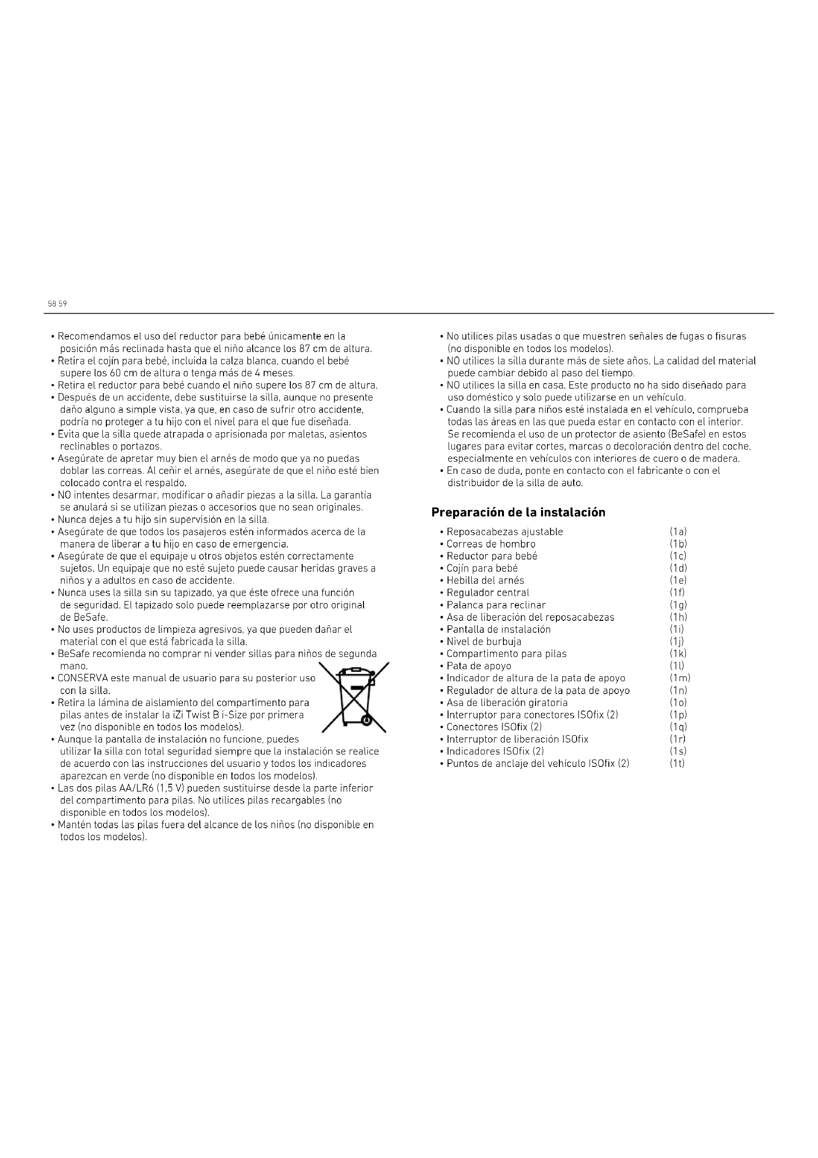 - La pata de apoyo debe usarse en todo momento. Asegúrate de que la pata esté totalmente bajada hasta que toque el suelo del vehículo delante de la silla y de que esta esté colocada en posición horizontal en el coche con el nivel de la burbuja en el centro. Los indicadores de la pata de apoyo deben aparecer siempre en verde. ! Es importante que leas este manual de usuario ANTES de instalar la silla, ya que una instalación incorrecta puede poner en peligro la vida de tu hijo. Gracias por elegir BeSafe iZi Twist B i-Size58 59