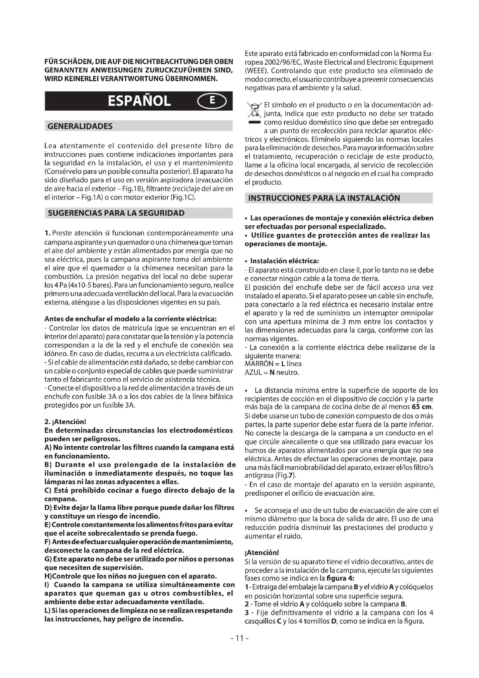 aparatos que queman gas u otros combustibles, el ambiente debe estar adecuadamente ventilado. L) Si las operaciones de limpieza no se realizan respetando las instrucciones, hay peligro de incendio. Este aparato está fabricado en conformidad con la Norma Eu- ropea 2002/96/EC, Waste Electrical and Electronic Equipment (WEEE). Controlando que este producto sea eliminado de modo correcto, el usuario contribuye a prevenir consecuencias negativas para el ambiente y la salud. El símbolo en el producto o en la documentación ad- junta, indica que este producto no debe ser tratado como residuo doméstico sino que debe ser entregado a un punto de recolección para reciclar aparatos eléc- tricos y electrónicos. Elimínelo siguiendo las normas locales para la eliminación de desechos. Para mayor información sobre el tratamiento, recuperación o reciclaje de este producto, llame a la oficina local encargada, al servicio de recolección de desechos domésticos o al negocio en el cual ha comprado el producto.