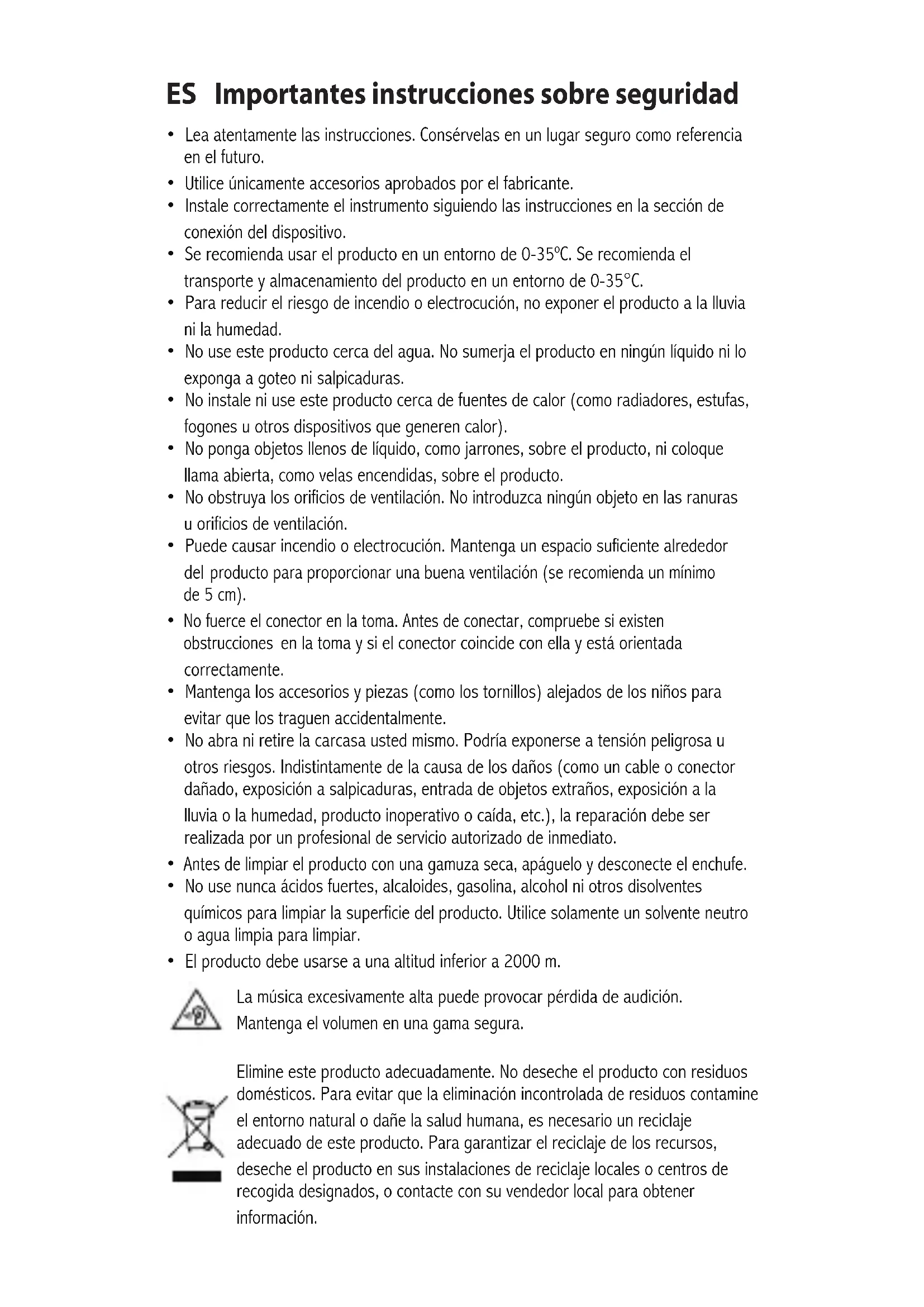 - El producto debe usarse a una altitud inferior a 2000 m. La música excesivamente alta puede provocar pérdida de audición. Mantenga el volumen en una gama segura. Elimine este producto adecuadamente. No deseche el producto con residuos domésticos. Para evitar que la eliminación incontrolada de residuos contamine el entorno natural o dañe la salud humana, es necesario un reciclaje adecuado de este producto. Para garantizar el reciclaje de los recursos, deseche el producto en sus instalaciones de reciclaje locales o centros de recogida designados, o contacte con su vendedor local para obtener información.Producto inalámbrico: