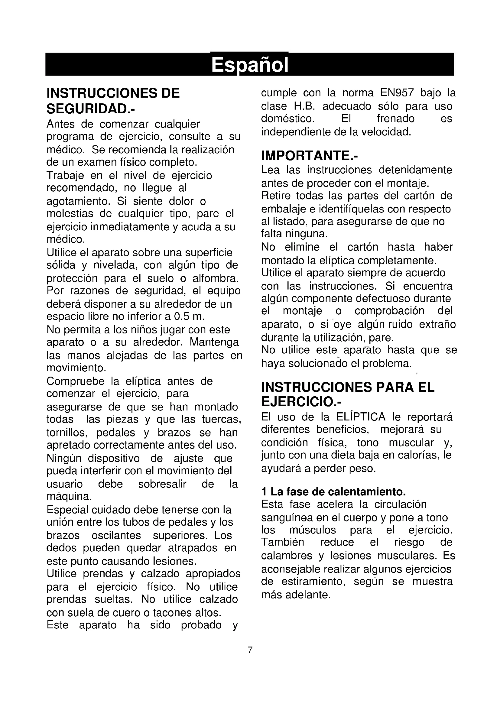 Español INSTRUCCIONES DE SEGURIDAD.- Antes de comenzar cualquier programa de ejercicio, consulte a su médico. Se recomienda la realización de un examen físico completo. Trabaje en el nivel de ejercicio recomendado, no llegue al agotamiento. Si siente dolor o molestias de cualquier tipo, pare el ejercicio inmediatamente y acuda a su médico. Utilice el aparato sobre una superficie sólida y nivelada, con algún tipo de protección para el suelo o alfombra. Por razones de seguridad, el equipo deberá disponer a su alrededor de un espacio libre no inferior a 0,5 m. No permita a los niños jugar con este aparato o a su alrededor. Mantenga las manos alejadas de las partes en movimiento. Compruebe la elíptica antes de comenzar el ejercicio, para asegurarse de que se han montado todas las piezas y que las tuercas, tornillos, pedales y brazos se han apretado correctamente antes del uso. Ningún dispositivo de ajuste que pueda interferir con el movimiento del usuario debe sobresalir de la máquina. Especial cuidado debe tenerse con la unión entre los tubos de pedales y los brazos oscilantes superiores. Los dedos pueden quedar atrapados en este punto causando lesiones. Utilice prendas y calzado apropiados para el ejercicio físico. No utilice prendas sueltas. No utilice calzado con suela de cuero o tacones altos. Este aparato ha sido probado y cumple con la norma EN957 bajo la clase H.B. adecuado sólo para uso doméstico. El frenado es independiente de la velocidad. IMPORTANTE.- Lea las instrucciones detenidamente antes de proceder con el montaje. Retire todas las partes del cartón de embalaje e identifíquelas con respecto al listado, para asegurarse de que no falta ninguna. No elimine el cartón hasta haber montado la elíptica completamente. Utilice el aparato siempre de acuerdo con las instrucciones. Si encuentra algún componente defectuoso durante el montaje o comprobación del aparato, o si oye algún ruido extraño durante la utilización, pare. No utilice este aparato hasta que se haya solucionado el problema.