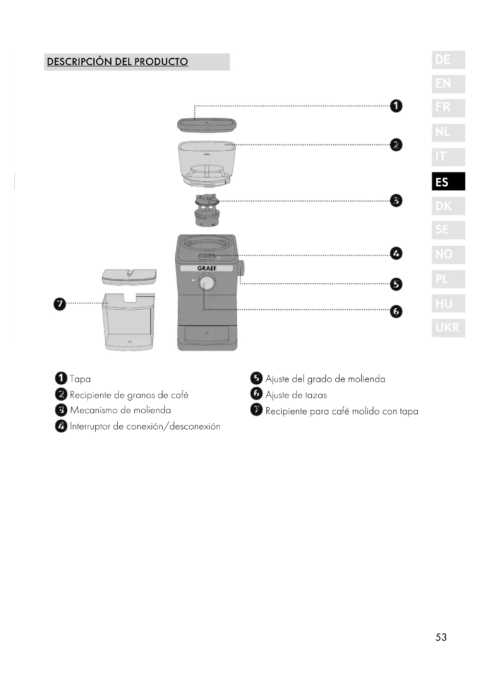 PRÓLOGO Estimado/a cliente: Ha hecho una buena elección al comprar este molinillo de café. Ha adquirido un producto de calidad reconocido. Le agradecemos su compra y le deseamos que disfrute con su nuevo molinillo de café Graef. INFORMACIÓN ACERCA DEL PRESENTE MANUAL DE INSTRUCCIONES El presente manual de instrucciones forma parte del molino de café (denominado de ahora en adelante, aparato) y aporta información esencial para la puesta en marcha, la seguridad, el uso previsto y la conservación del aparato. El manual de instrucciones debe guardarse siempre a mano, cerca del aparato. Debe ser leído y utilizado por la persona encargada de: ● La puesta en marcha, ● El manejo, ● la resolución de fallos; y/o ● Limpieza Conserve el presente manual de instrucciones y facilítelo junto con el aparato a las terceras personas que vayan a utilizarlo en el futuro. Este manual de instrucciones no puede tener en cuenta todos los aspectos imaginables. Para más información o en caso de problemas que no se traten en este manual de instrucciones o no se traten con suficiente detalle, diríjase al servicio de atención al cliente de Graef o a su distribuidor especializado. ADVERTENCIAS En el presente manual de instrucciones se utilizan las siguientes advertencias y palabras de advertencia: ADVERTENCIA Indica una situación potencialmente peligrosa. El incumplimiento de esta indicación puede producir lesiones de gravedad o provocar incluso la muerte. ATENCIÓN Indica una situación potencialmente peligrosa. En caso de incumplimiento de la indicación se pueden producir daños materiales. ¡IMPORTANTE! Indica consejos de uso y otras informaciones de especial importancia.55