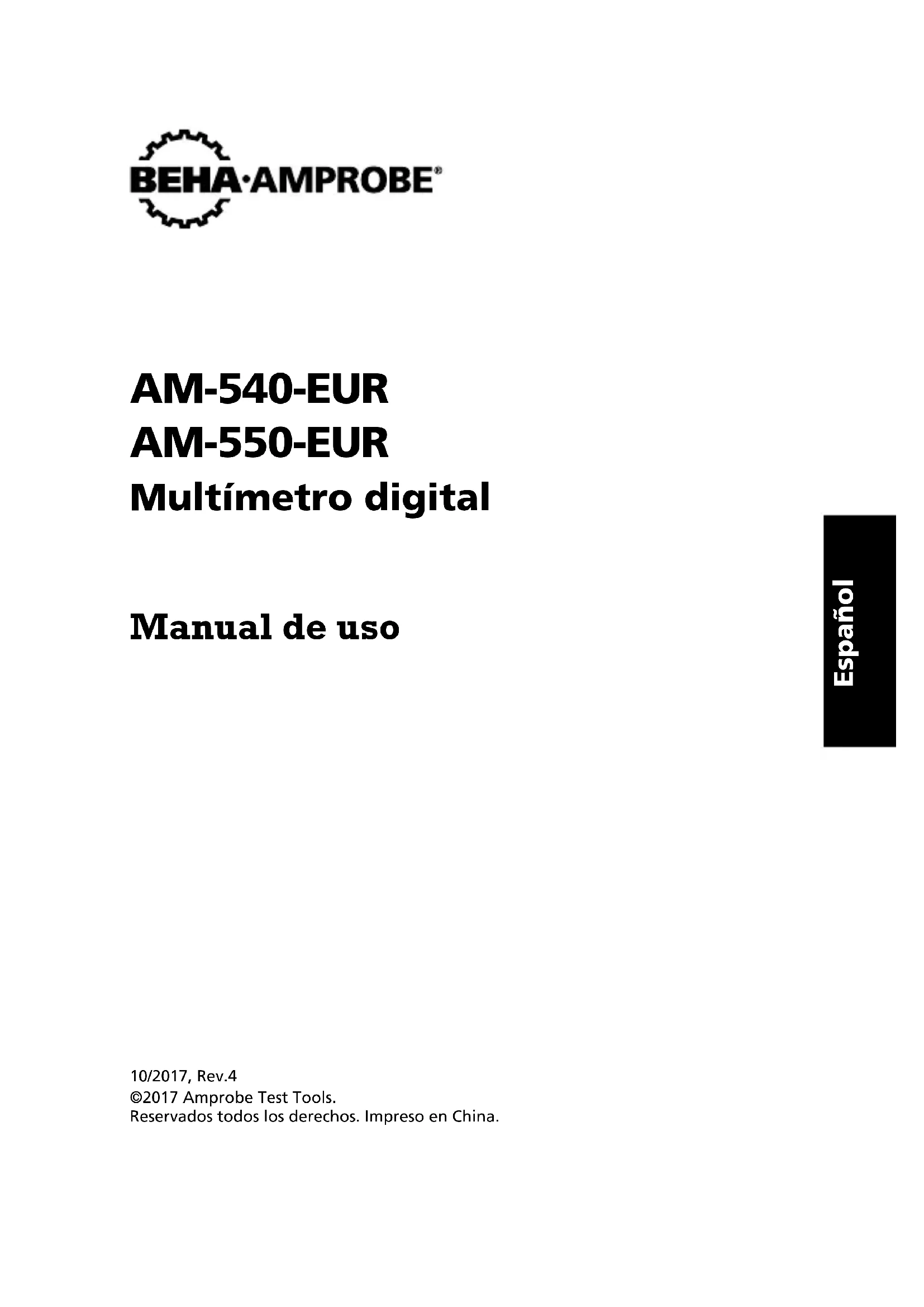 Pila 9 V F2Español AM-540-EUR AM-550-EUR Multímetro digital Manual de uso 10/2017, Rev.4 ©2017 Amprobe Test Tools. Reservados todos los derechos. Impreso en China.Garantía limitada y limitación de responsabilidades Su producto de Amprobe está garantizado contra defectos de material y mano de obra durante 1 año a partir de la fecha de compra, salvo que la legislación de su país estipule lo contrario. Esta garantía no cubre fusibles, baterías desechables, ni daños derivados de accidentes, negligencia, uso indebido, alteración, contaminación o condiciones anormales de uso o manipulación. Los revendedores no están autorizados a extender ninguna otra garantía en nombre de Amprobe. Para obtener servicio durante el período de garantía, devuelva el producto acompañado del comprobante de compra a un centro de servicio de Amprobe autorizado o a un concesionario o distribuidor de Amprobe. Consulte el apartado Reparación para obtener información más detallada. ESTA GARANTÍA CONSTITUYE SU ÚNICO RECURSO. TODAS LAS DEMÁS GARANTÍAS, TANTO EXPRESAS COMO IMPLÍCITAS O ESTATUTARIAS, INCLUIDAS LAS GARANTÍAS IMPLÍCITAS DE IDONEIDAD PARA UN PROPÓSITO DETERMINADO O DE COMERCIABILIDAD, QUEDAN POR LA PRESENTE DENEGADAS. EL FABRICANTE NO SERÁ RESPONSABLE DE LOS DAÑOS O PÉRDIDAS ESPECIALES, INDIRECTOS, CONTINGENTES O RESULTANTES, QUE SE DERIVEN DE CUALQUIER CAUSA O TEORÍA. Debido a que determinados estados o países no permiten la exclusión o limitación de una garantía implícita o de los daños contingentes o resultantes, esta limitación de responsabilidad puede no regir para usted. Reparación Todas las herramientas de prueba que se devuelvan para su reparación, cubierta o no por garantía, o para su calibración, deben ir acompañadas de lo siguiente: su nombre, el nombre de su empresa, el domicilio, el número de teléfono y el comprobante de compra. Además, incluya una breve descripción del problema o del servicio solicitado y adjunte los conductores de prueba del medidor. La reparación fuera de garantía o los cargos de sustitución deben remitirse en la forma de cheque, giro postal, tarjeta de crédito con fecha de vencimiento u orden de compra pagadera a Amprobe®. Reparaciones y sustituciones cubiertas por la garantía – Todos los países Sírvase leer la declaración de garantía y compruebe las baterías antes de solicitar la reparación. Durante el período de garantía, toda herramienta de prueba defectuosa puede devolverse al distribuidor de Amprobe® para cambiarla por otra igual o por un producto similar. Consulte el apartado “Where to buy” en www.amprobe.com para ver una lista de distribuidores locales. Asimismo, las unidades de reparación en garantía y las unidades de reemplazo en los Estados Unidos y Canadá también pueden enviarse al Centro de servicio Amprobe® (consulte la dirección más abajo). Reparaciones y sustituciones no cubiertas por la garantía – Estados Unidos y Canadá Las reparaciones fuera de la garantía en los Estados Unidos y Canadá deben enviarse a un Centro de servicio de Amprobe®. Llame a Amprobe® o pregunte en su punto de compra para conocer las tarifas actuales de reparación y sustitución de productos. En Estados Unidos En Canadá Amprobe Amprobe Everett, WA 98203 Mississauga, Ontario L4Z 1X9 Tel.: 877-AMPROBE (267-7623) Tel.: 905-890-7600 Reparaciones y sustituciones no cubiertas por la garantía – Europa El distribuidor de Amprobe® puede sustituir las unidades vendidas en Europa no cubiertas por la garantía por un coste nominal. Consulte el apartado “Where to buy” en www.amprobe.com para ver una lista de distribuidores locales. Dirección para envío de correspondencia en Europa* Amprobe® Europe Beha-Amprobe GmbH In den Engematten 14 79286 Glottertal, Alemania Tel.: +49 (0) 7684 8009 - 0 www.amprobe.eu *(Correspondencia solamente. En esta dirección no se proporcionan reparaciones ni sustituciones de productos. Los clientes europeos deben ponerse en contacto con su distribuidor).AM-540-EUR / AM-550-EUR Multímetro digital