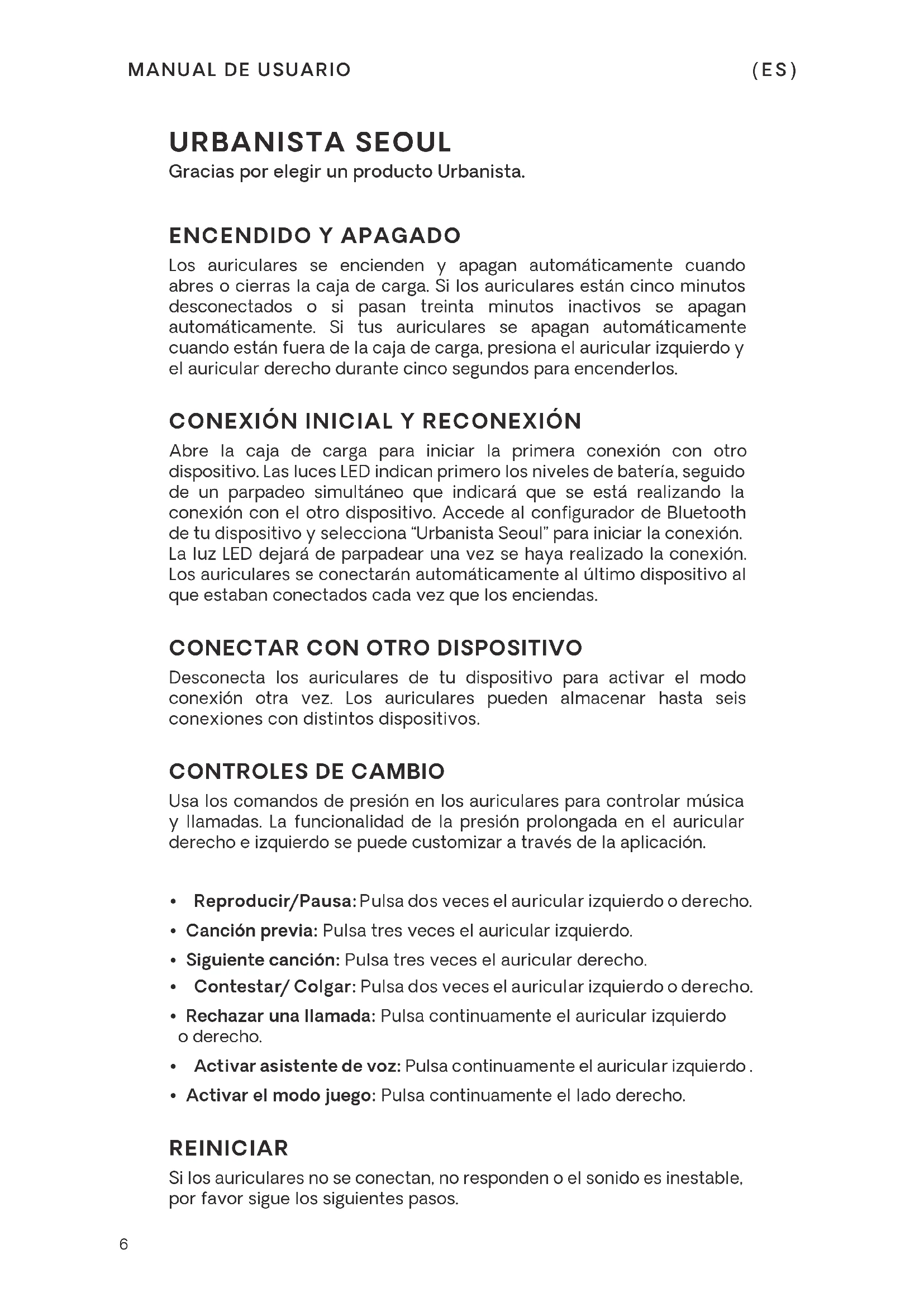 (ES)8 ALMOHADILLAS DE SILICONALas almohadillas de silicona incluidas tienen distintos tamaños. Elige un tamaño que te quepa cómodamente en los oídos y te proporcione un sellado eficaz. DETECCIÓN Y RESOLUCIÓN DE PROBLEMAS Si tienes alguna pregunta adicional, visita nuestro centro de ayuda en línea, donde encontrarás nuestras preguntas frecuentes y una versión en línea de este manu: https://support.urbanista.com/