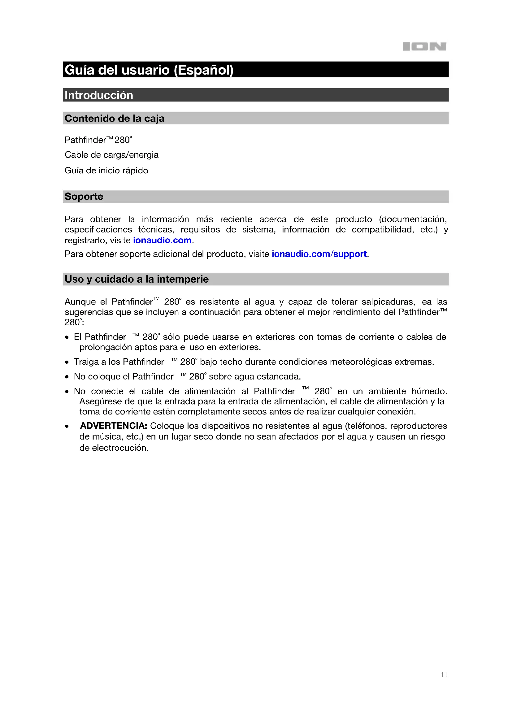 280˚ Cable de carga/energia Guía de inicio rápido Soporte Para obtener la información más reciente acerca de este producto (documentación, especificaciones técnicas, requisitos de sistema, información de compatibilidad, etc.) y registrarlo, visite ionaudio.com. Para obtener soporte adicional del producto, visite ionaudio.com/support. Uso y cuidado a la intemperie Aunque el Pathfinder