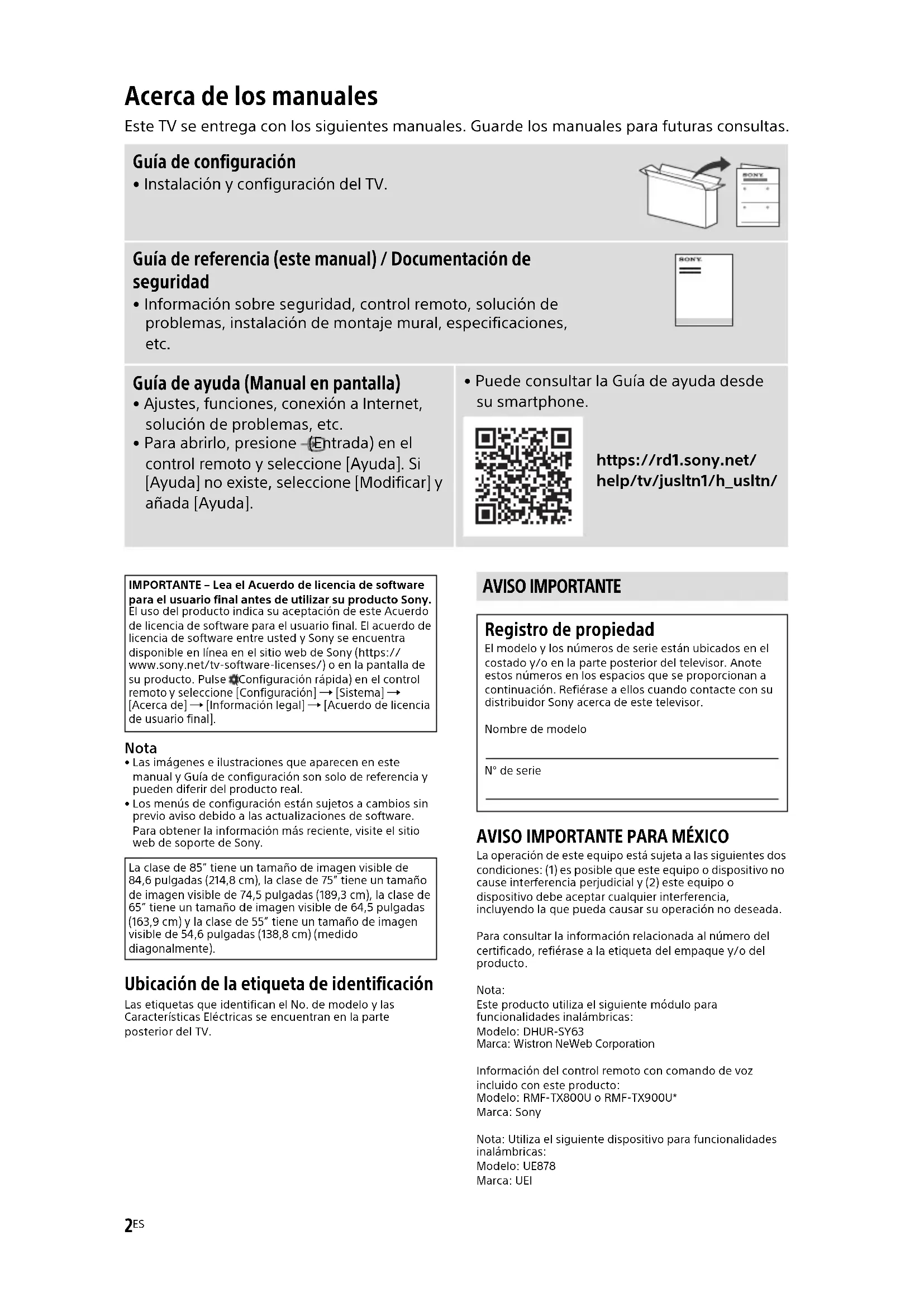 - Puede consultar la Guía de ayuda desde su smartphone. https://rd1.sony.net/ help/tv/jusltn1/h_usltn/ IMPORTANTE – Lea el Acuerdo de licencia de software para el usuario final antes de utilizar su producto Sony. El uso del producto indica su aceptación de este Acuerdo de licencia de software para el usuario final. El acuerdo de licencia de software entre usted y Sony se encuentra disponible en línea en el sitio web de Sony (https:// www.sony.net/tv-software-licenses/) o en la pantalla de su producto. Pulse (Configuración rápida) en el control remoto y seleccione [Configuración] [Sistema] [Acerca de] [Información legal] [Acuerdo de licencia de usuario final]. La clase de 85” tiene un tamaño de imagen visible de 84,6 pulgadas (214,8 cm), la clase de 75” tiene un tamaño de imagen visible de 74,5 pulgadas (189,3 cm), la clase de 65” tiene un tamaño de imagen visible de 64,5 pulgadas (163,9 cm) y la clase de 55” tiene un tamaño de imagen visible de 54,6 pulgadas (138,8 cm) (medido diagonalmente). AVISO IMPORTANTE Registro de propiedad El modelo y los números de serie están ubicados en el costado y/o en la parte posterior del televisor. Anote estos números en los espacios que se proporcionan a continuación. Refiérase a ellos cuando contacte con su distribuidor Sony acerca de este televisor. Nombre de modelo N° de serie3