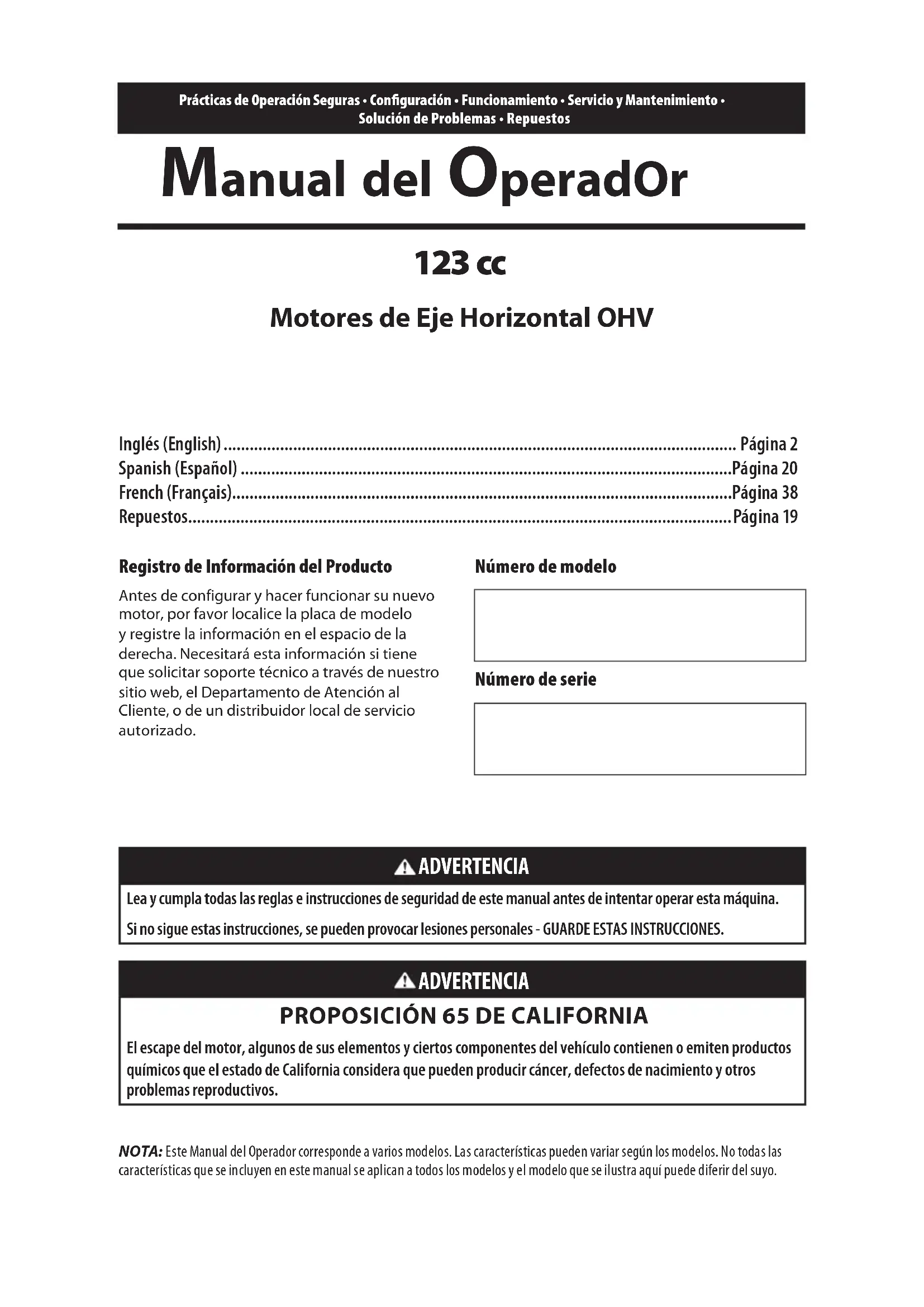 - Clé (si l’appareil en est équipé)Prácticas de Operación Seguras • Configuración • Funcionamiento • Servicio y Mantenimiento • Solución de Problemas • Repuestos Manual del OperadOr 123 cc Motores de Eje Horizontal OHV NOTA: Este Manual del Operador corresponde a varios modelos. Las características pueden variar según los modelos. No todas las características que se incluyen en este manual se aplican a todos los modelos y el modelo que se ilustra aquí puede diferir del suyo. ADVERTENCIA Lea y cumpla todas las reglas e instrucciones de seguridad de este manual antes de intentar operar esta máquina. Si no sigue estas instrucciones, se pueden provocar lesiones personales - GUARDE ESTAS INSTRUCCIONES. ADVERTENCIA