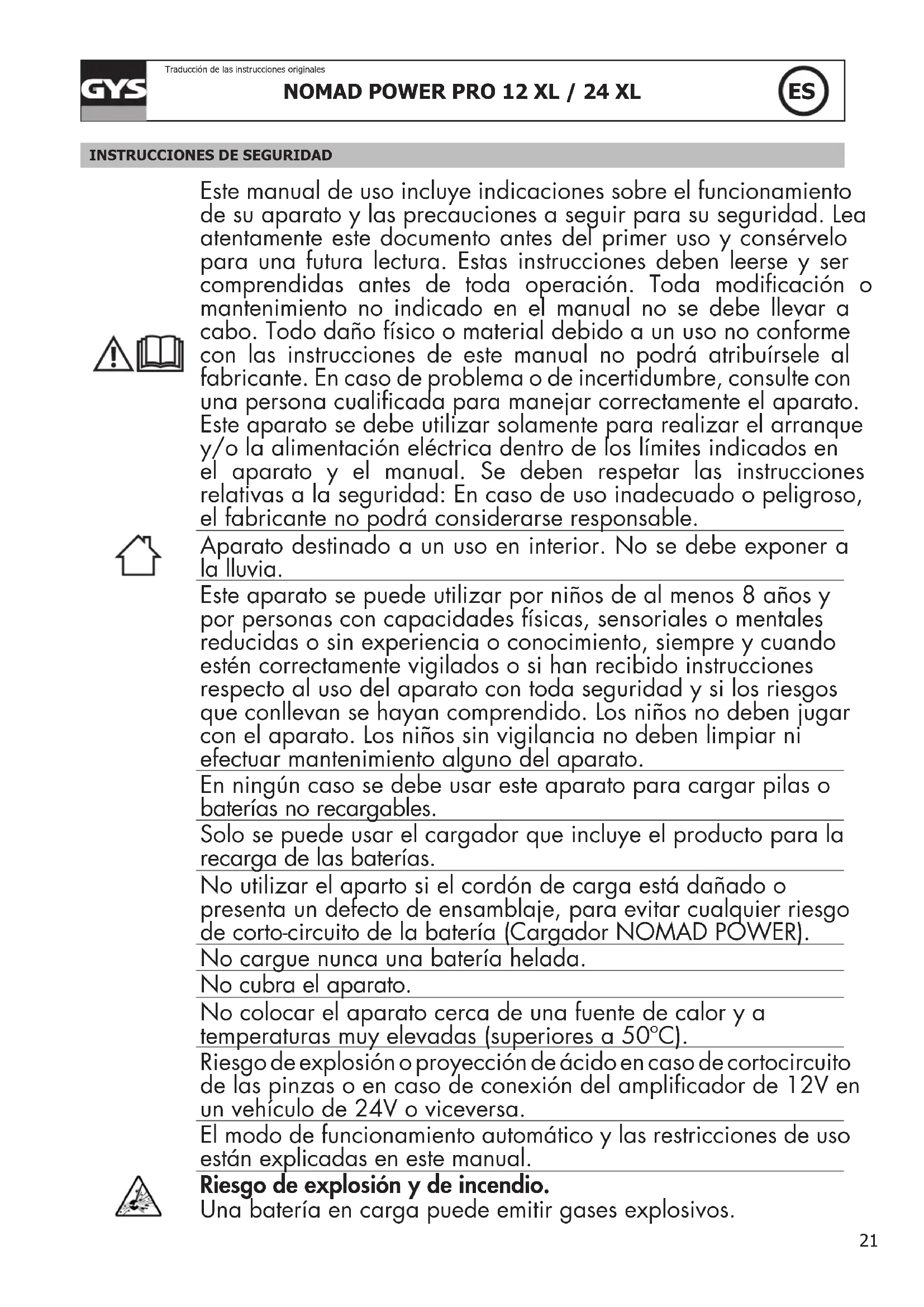 Este manual de uso incluye indicaciones sobre el funcionamiento de su aparato y las precauciones a seguir para su seguridad. Lea atentamente este documento antes del primer uso y consérvelo para una futura lectura. Estas instrucciones deben leerse y ser comprendidas antes de toda operación. Toda modicación o mantenimiento no indicado en el manual no se debe llevar a cabo. Todo daño físico o material debido a un uso no conforme con las instrucciones de este manual no podrá atribuírsele al fabricante. En caso de problema o de incertidumbre, consulte con una persona cualicada para manejar correctamente el aparato. Este aparato se debe utilizar solamente para realizar el arranque y/o la alimentación eléctrica dentro de los límites indicados en el aparato y el manual. Se deben respetar las instrucciones relativas a la seguridad: En caso de uso inadecuado o peligroso, el fabricante no podrá considerarse responsable. Aparato destinado a un uso en interior. No se debe exponer a la lluvia. Este aparato se puede utilizar por niños de al menos 8 años y por personas con capacidades físicas, sensoriales o mentales reducidas o sin experiencia o conocimiento, siempre y cuando estén correctamente vigilados o si han recibido instrucciones respecto al uso del aparato con toda seguridad y si los riesgos que conllevan se hayan comprendido. Los niños no deben jugar con el aparato. Los niños sin vigilancia no deben limpiar ni efectuar mantenimiento alguno del aparato. En ningún caso se debe usar este aparato para cargar pilas o baterías no recargables. Solo se puede usar el cargador que incluye el producto para la recarga de las baterías. No utilizar el aparto si el cordón de carga está dañado o presenta un defecto de ensamblaje, para evitar cualquier riesgo de corto-circuito de la batería (Cargador NOMAD POWER). No cargue nunca una batería helada. No cubra el aparato. No colocar el aparato cerca de una fuente de calor y a temperaturas muy elevadas (superiores a 50ºC). Riesgo de explosión o proyección de ácido en caso de cortocircuito de las pinzas o en caso de conexión del amplicador de 12V en un vehículo de 24V o viceversa. El modo de funcionamiento automático y las restricciones de uso están explicadas en este manual. Riesgo de explosión y de incendio. Una batería en carga puede emitir gases explosivos.22