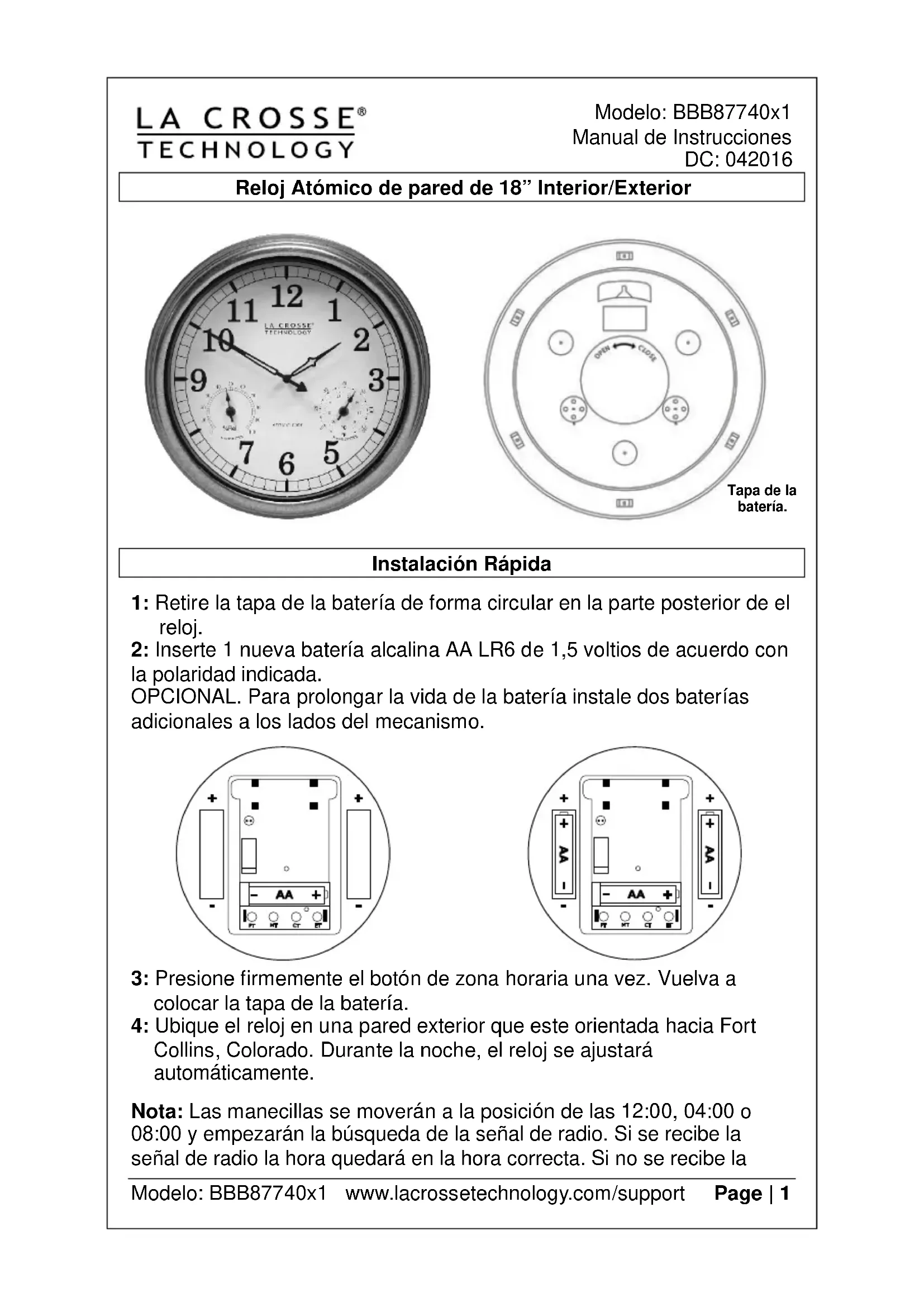 3: Presione firmemente el botón de zona horaria una vez. Vuelva a colocar la tapa de la batería. 4: Ubique el reloj en una pared exterior que este orientada hacia Fort Collins, Colorado. Durante la noche, el reloj se ajustará automáticamente. Nota: Las manecillas se moverán a la posición de las 12:00, 04:00 o 08:00 y empezarán la búsqueda de la señal de radio. Si se recibe la señal de radio la hora quedará en la hora correcta. Si no se recibe la Tapa de la batería.Modelo: BBB87740x1 www.lacrossetechnology.com/support Page | 2 señal de radio, el reloj se quedará en la posición de las 12:00, 04:00 o 08:00 y buscará la señal horaria WWVB en las siguientes horas. Una vez que se decodifica la señal de radio, las manecillas se ajustarán automáticamente a la hora correcta. Esto puede tardar hasta 5 noches. 5: La zona horaria predeterminada es la hora del Pacífico. Si la hora en el reloj esta descuadrada, mantenga presionado el botón de zona horaria durante 5 segundos para corregir. Posición del Reloj