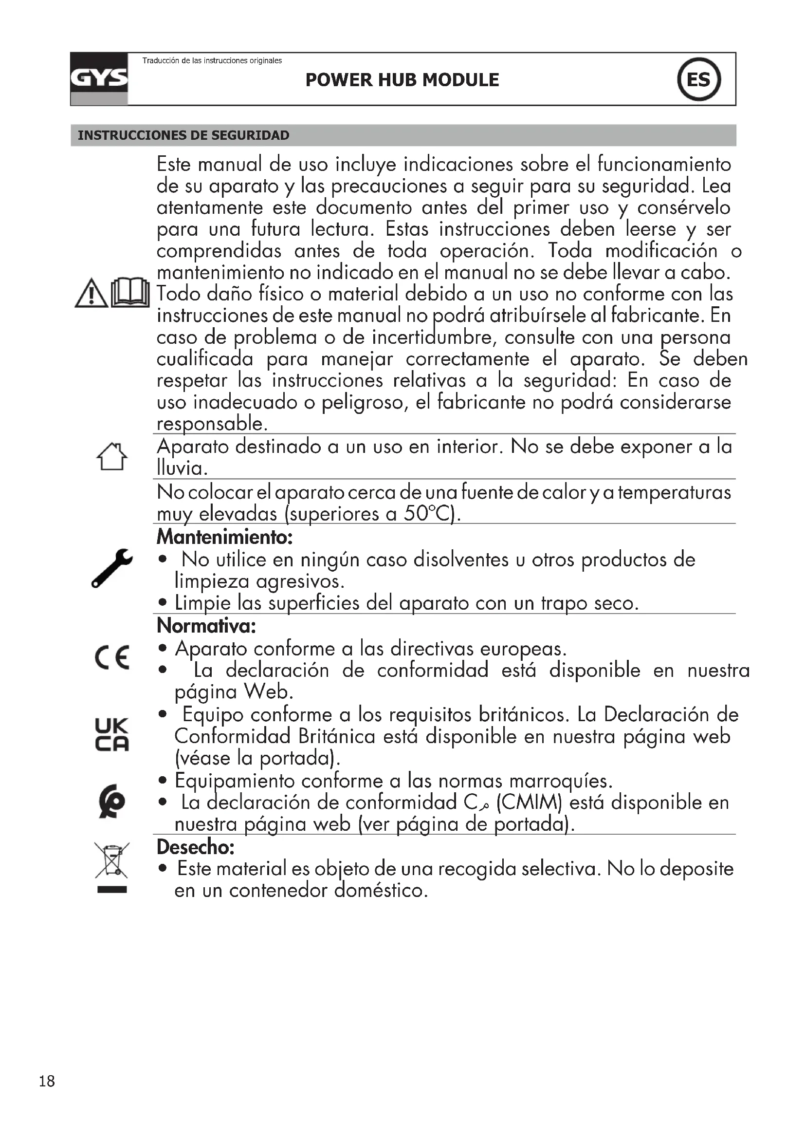 Traducción de las instrucciones originalesDESCRIPCIÓN GENERALEl Power Hub Module (PHM) es un accesorio que permite acoplar los Gysashes en paralelo (máximo 4) para sumar su potencia y recargar una batería de gran capacidad.Las Gysashes conectadas deben ser idénticas.El PHM debe estar asociado a un SHM Smart Hub Module (ref. 025981) que establece la comunicación entre todos los Gysashes conectados.