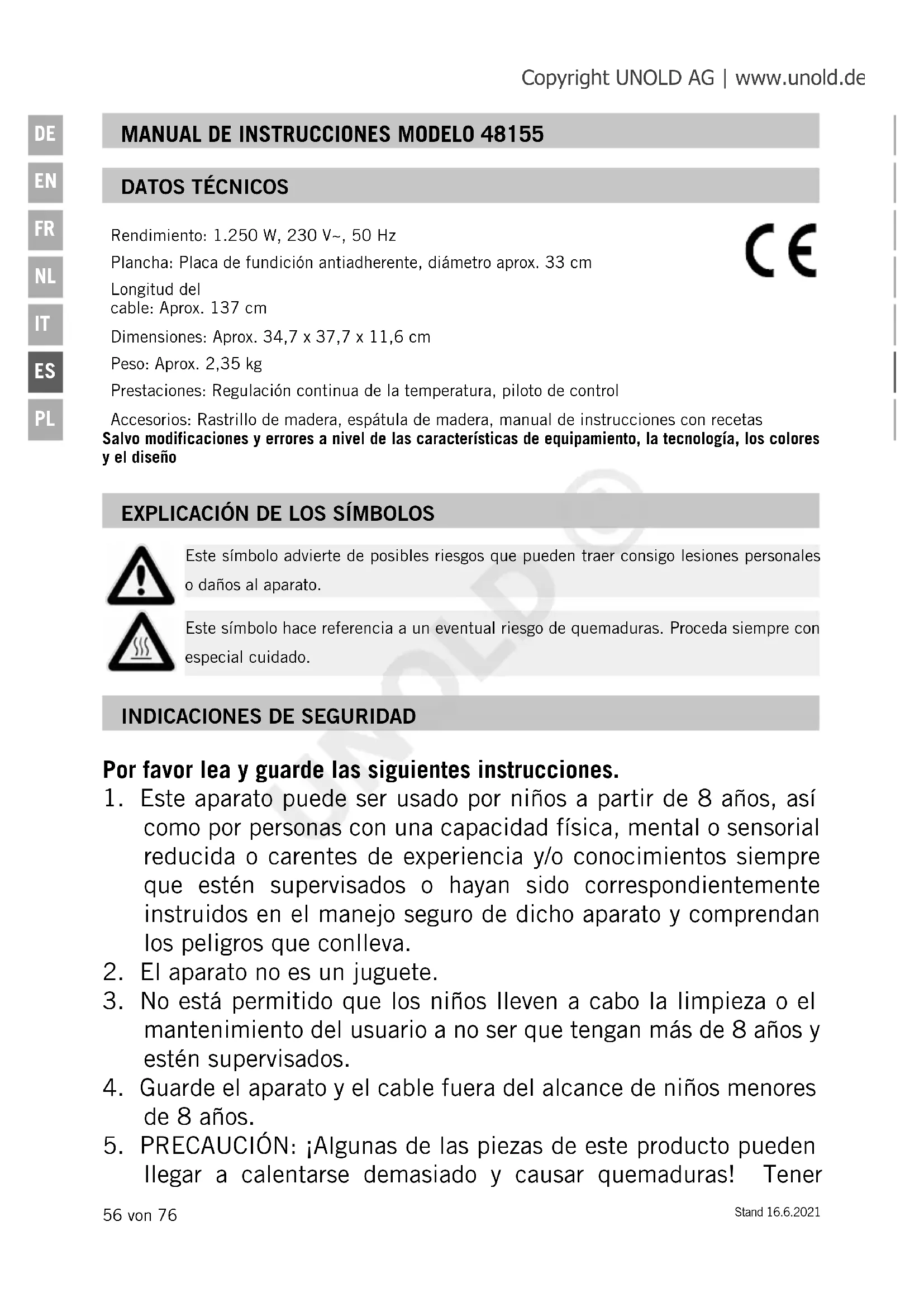 Este símbolo advierte de posibles riesgos que pueden traer consigo lesiones personales o daños al aparato. Este símbolo hace referencia a un eventual riesgo de quemaduras. Proceda siempre con especial cuidado. Copyright UNOLD AG | www.unold.de UNOLD ©Stand 16.6.2021 57 von 76