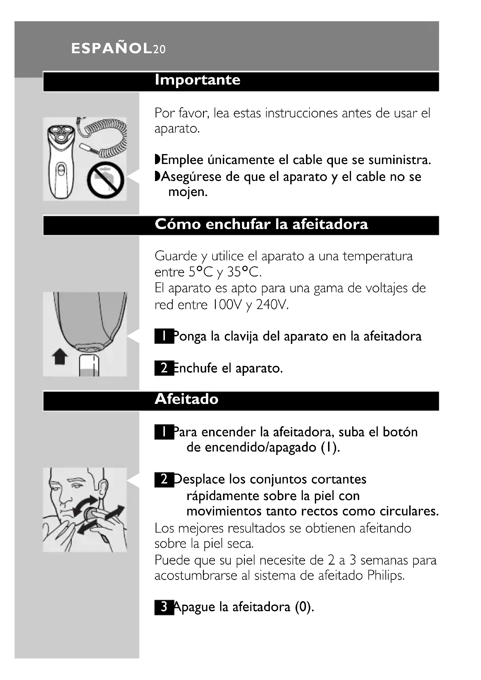 ◗ Asegúrese de que el aparato y el cable no se mojen. Cómo enchufar la afeitadora Guarde y utilice el aparato a una temperatura entre 5cC y 35cC. El aparato es apto para una gama de voltajes de red entre 100V y 240V.
