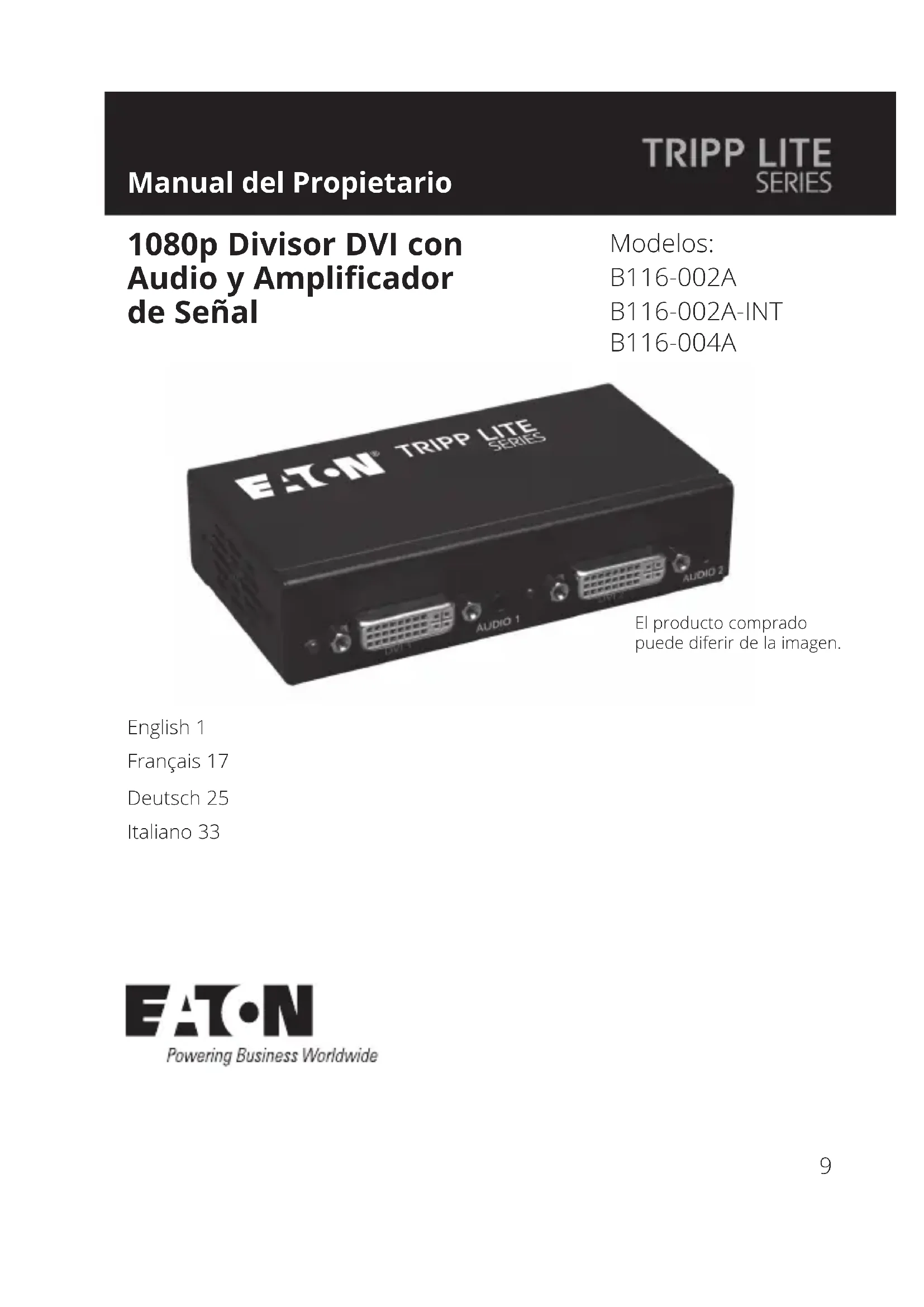 - Devolver el equipo nuevo para nes de reciclaje una vez que nalmente se convierta en residuoEaton tiene una política de mejora continua. Las especicaciones están sujetas a cambio sin previo aviso. Garantía Eaton 1000 Eaton Boulevard Cleveland, OH 44122 Estados Unidos Eaton.com © 2024 Eaton Todos los derechos reservados Publicación No. 23-10-224 / 93-38AD_RevC Febrero 2024 Eaton es una marca registrada. Todas las marcas registradas son propiedad de sus respectivos propietarios. 9338AD 9338AD17 Manuel d'utilisation Le produit acheté peut différer de l'image. Modèles: B116-002A