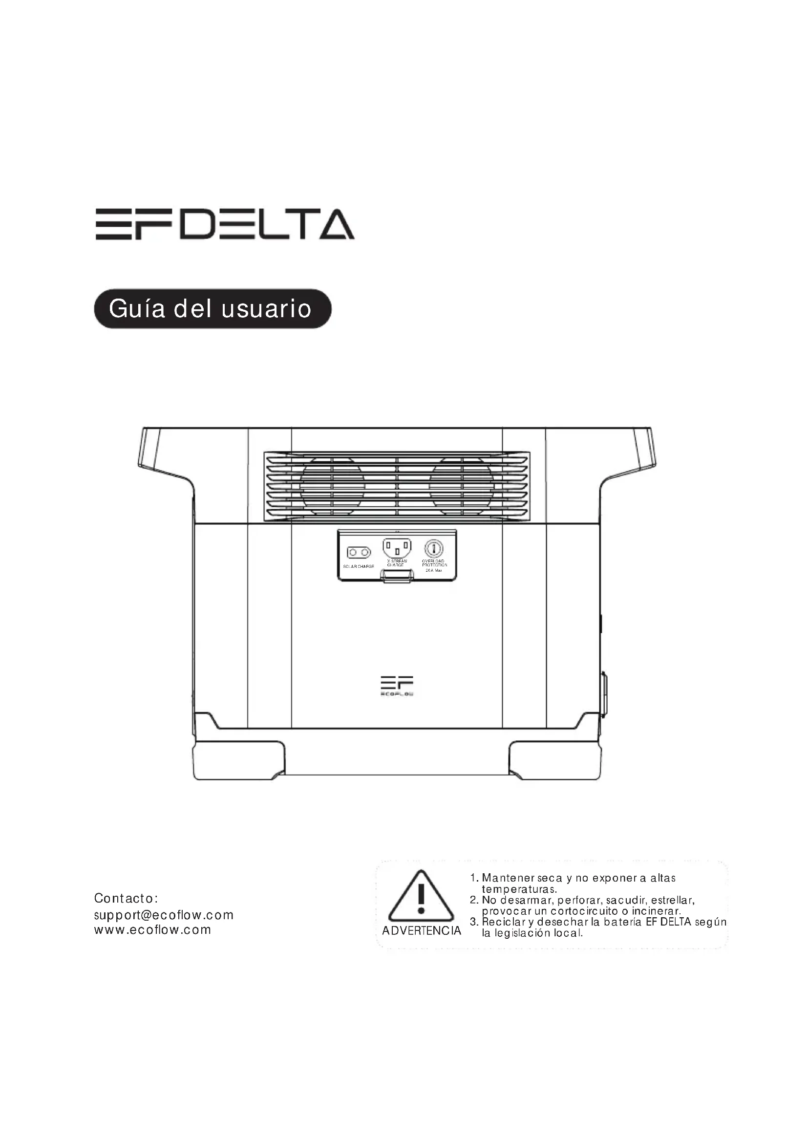 Especificaciones generalesPeso netoDimensionesCapacidadComprobación y certificaciónOutputSalida USB A (x2)Carga rápida USB A (x2)Salida USB C (x2)Salida de potencia del automóvil (x1)30,9 lbs (14 kg)15,7 x 8,3 x 10,6 pulgadas (40 x 21 x 27cm)1008Wh / 1260Wh (50.4V)UL CE FCC RoHS PSE 5 V DC, 2,4 A, 12 W máx. por puerto108,8W,13,6 V DC,8 A máx.Carga X-STREAM de 1200 W máx.SOLO 220-240V CA (50 Hz/60 Hz)400W, 10-65V DC, 10 A máx.12V/24V DC 10A maxIon de litio18650-4 a 140 °F (-20 a 60 °C)32 a 113 °F (0 a 45 °C)1 año (tras una carga completa)800 ciclos (60 %)EntradaEnergía de entrada de carga CAVoltaje de entrada de carga CAEntrada de carga solarCargador(Ejemplo 2)BateríaQuímica celularTipo de célulaTemperatura de descargaTemperatura de cargaDuraciónVida útil 5 V DC,9 V DC, 12 V DC, 2,4 A, 28 W máx. por puerto 5 V DC,9 V, DC 15 V DC, 20 V DC, 3 A, 60 W máx. por puerto1600 W (aumento 3100 W) total,230V( 50Hz)CA 1800W (aumento 3300W) total,230V (50Hz) CAEjemplo 1 : Ejemplo 2 :Salida de CA (x6)/(x4)Onda sinusoidal completaCuidado de la batería EF DELTA – La batería EF DELTA está diseñada para varios usos de manera que es muy posible que requiera de una limpieza no muy profunda cada tanto. Use una tela seca de un material no abrasivo. Es preferible que use limpiadores diseñados para los teléfonos móviles y los monitores de computadoras si necesita de una ayuda adicional. ¡No lo bañe! ¿Cómo guardo la batería EF DELTA? – Guárdela en un lugar seco fuera del contacto directo con otros elementos. Para conservar la batería en un estado óptimo, almacenar EF DELTA a temperatura ambiente. Asegúrese de recargar EF DELTA a alrededor del 85% cada 3 meses para un rendimiento óptimo. Esto extiende la vida útil de la batería y garantiza que la batería EF DELTA esté lista para recargar cualquier dispositivo en todo momento. De no ser posible, la batería EF DELTA conservará su carga con poca potencia por casi un año. ¿Cómo utilizo la batería EF DELTA de manera segura? – Utilice EF DELTA en condiciones de temperatura dentro de su rango de temperatu- ra de operación. El uso de EF DELTA fuera de su rango operativo de temperatura óptima puede someterlo a condiciones inseguras e inefectivas. No sumerja en agua a la batería EF DELTA. No es resistente al agua. Esto dejará su garantía sin efecto. Si desea proteger EF DELTA contra la humedad y el polvo, use un protector EF DELTA (IP54) o una caja de seguridad (IP68, se puede adquirir en ecoflow.com) No maltrate la batería EF DELTA. Trate a la batería EF DELTA de la misma manera que trata a los dispositivos que conecta a ésta: con cuidado. Preguntas frecuentes