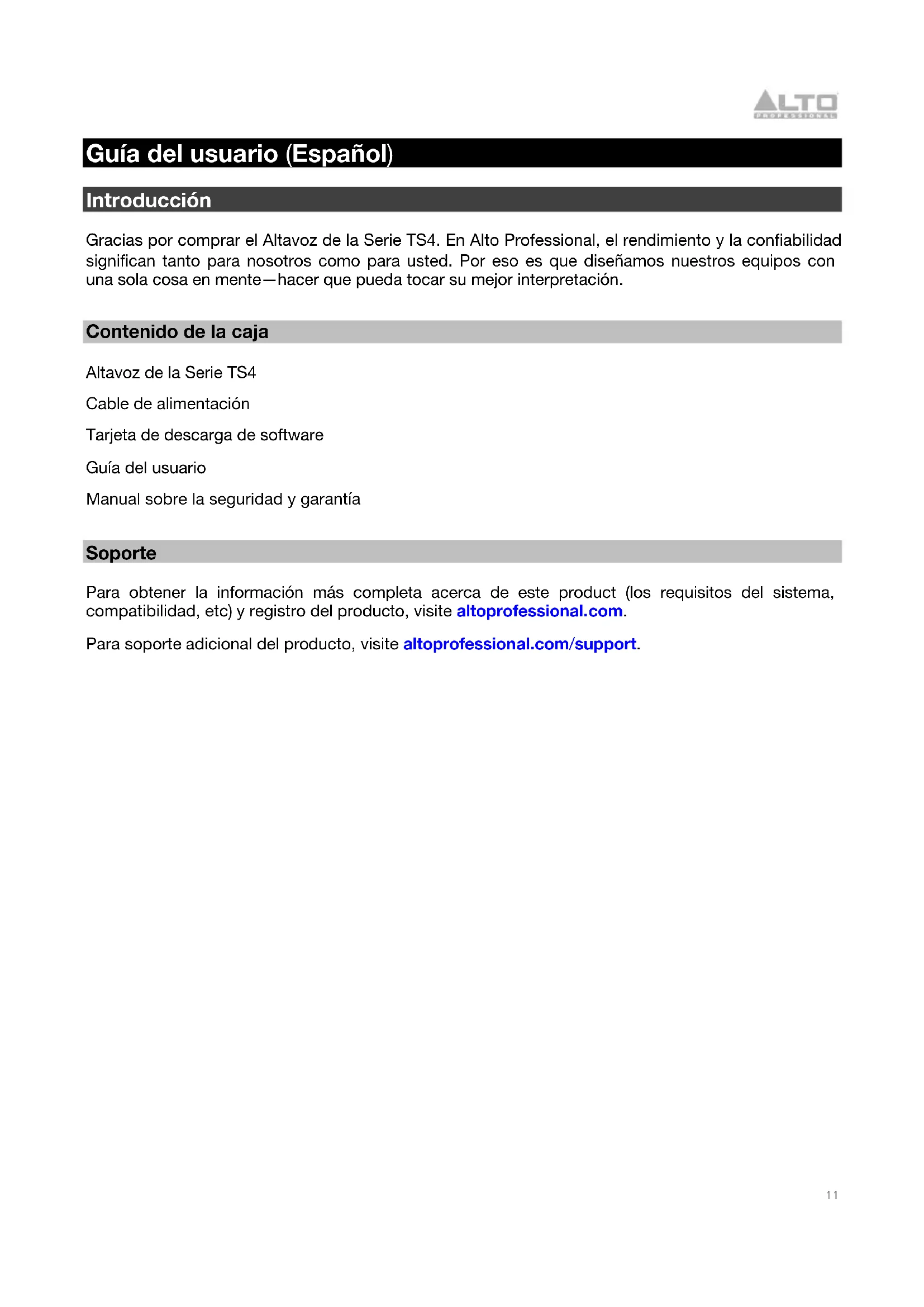 Guía del usuario (Español) Introducción Gracias por comprar el Altavoz de la Serie TS4. En Alto Professional, el rendimiento y la confiabilidad significan tanto para nosotros como para usted. Por eso es que diseñamos nuestros equipos con una sola cosa en mente—hacer que pueda tocar su mejor interpretación. Contenido de la caja Altavoz de la Serie TS4 Cable de alimentación Tarjeta de descarga de software Guía del usuario Manual sobre la seguridad y garantía Soporte Para obtener la información más completa acerca de este product (los requisitos del sistema, compatibilidad, etc) y registro del producto, visite altoprofessional.com. Para soporte adicional del producto, visite altoprofessional.com/support.12
