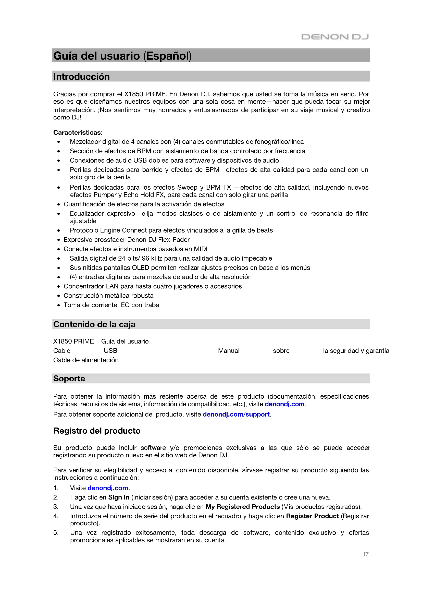 - Toma de corriente IEC con traba Contenido de la caja X1850 PRIME Guía del usuario Cable USB Manual sobre la seguridad y garantía Cable de alimentación Soporte Para obtener la información más reciente acerca de este producto (documentación, especificaciones técnicas, requisitos de sistema, información de compatibilidad, etc.), visite denondj.com. Para obtener soporte adicional del producto, visite denondj.com/support. Registro del producto Su producto puede incluir software y/o promociones exclusivas a las que sólo se puede acceder registrando su producto nuevo en el sitio web de Denon DJ. Para verificar su elegibilidad y acceso al contenido disponible, sírvase registrar su producto siguiendo las instrucciones a continuación: