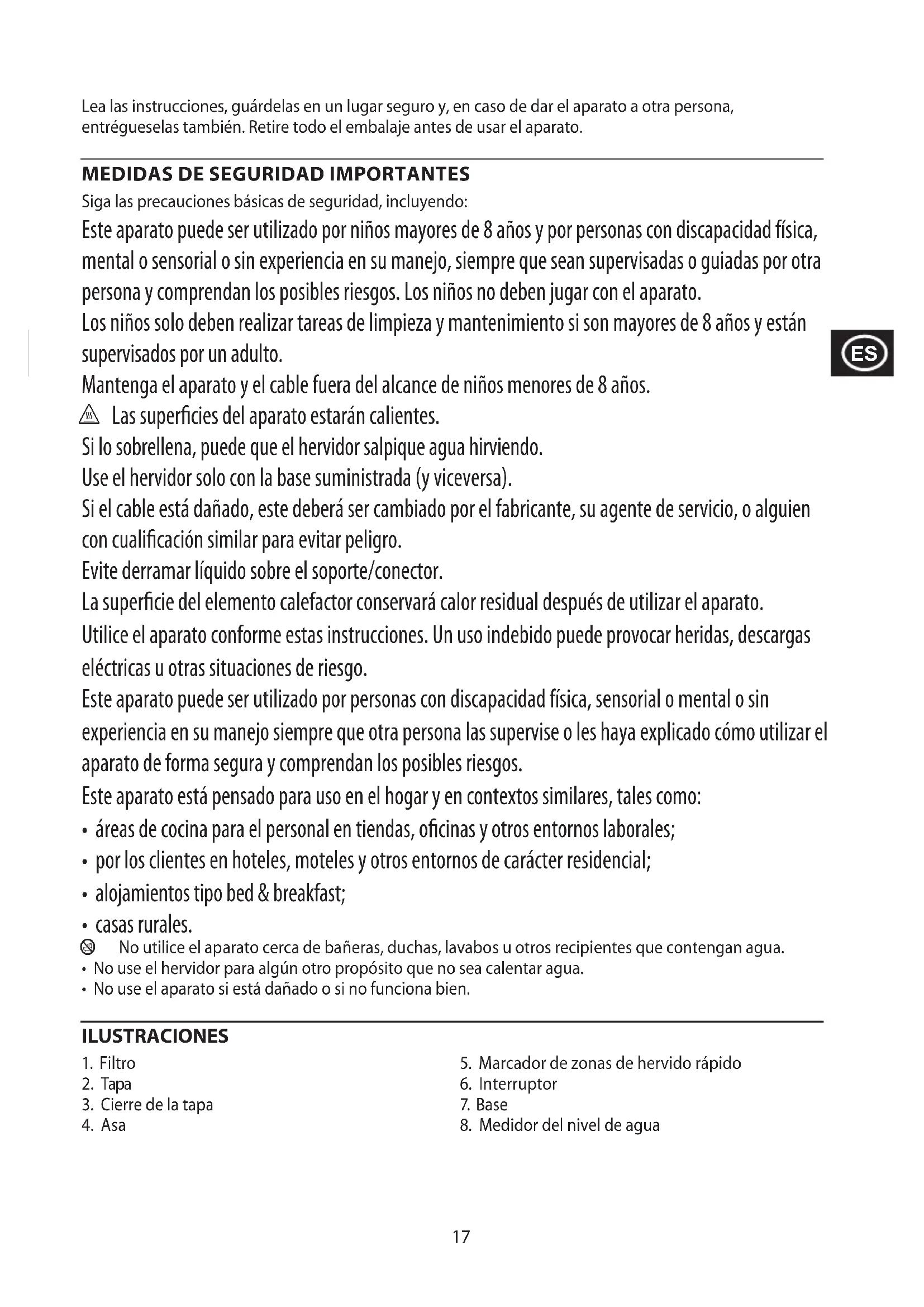 Siga las precauciones básicas de seguridad, incluyendo: Este aparato puede ser utilizado por niños mayores de 8 años y por personas con discapacidad física, mental o sensorial o sin experiencia en su manejo, siempre que sean supervisadas o guiadas por otra persona y comprendan los posibles riesgos. Los niños no deben jugar con el aparato. Los niños solo deben realizar tareas de limpieza y mantenimiento si son mayores de 8 años y están supervisados por un adulto. Mantenga el aparato y el cable fuera del alcance de niños menores de 8 años. h Las supercies del aparato estarán calientes. Si lo sobrellena, puede que el hervidor salpique agua hirviendo. Use el hervidor solo con la base suministrada (y viceversa). Si el cable está dañado, este deberá ser cambiado por el fabricante, su agente de servicio, o alguien con cualicación similar para evitar peligro. Evite derramar líquido sobre el soporte/conector. La supercie del elemento calefactor conservará calor residual después de utilizar el aparato. Utilice el aparato conforme estas instrucciones. Un uso indebido puede provocar heridas, descargas eléctricas u otras situaciones de riesgo. Este aparato puede ser utilizado por personas con discapacidad física, sensorial o mental o sin experiencia en su manejo siempre que otra persona las supervise o les haya explicado cómo utilizar el aparato de forma segura y comprendan los posibles riesgos. Este aparato está pensado para uso en el hogar y en contextos similares, tales como: