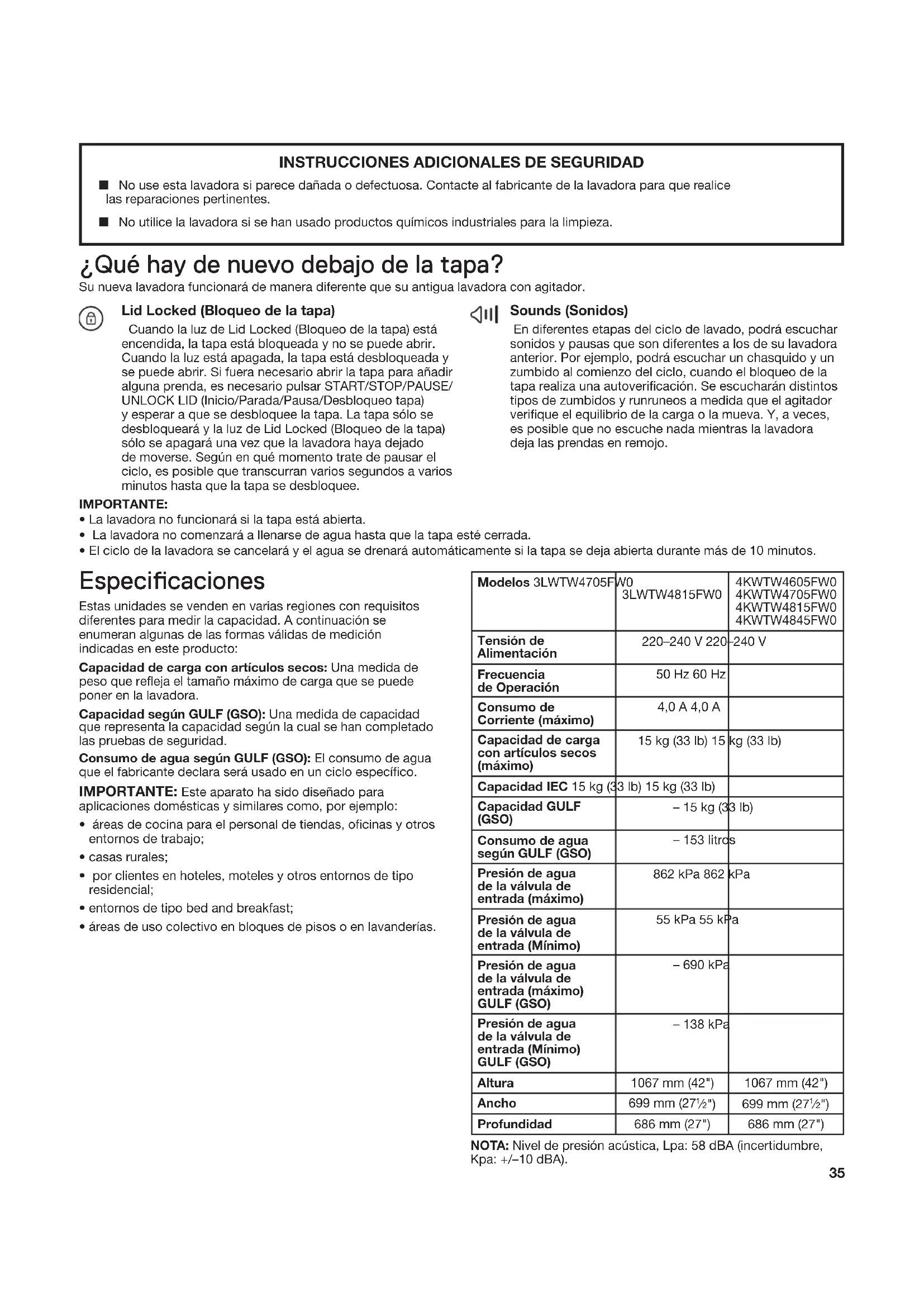- El ciclo de la lavadora se cancelará y el agua se drenará automáticamente si la tapa se deja abierta durante más de 10 minutos. Sounds (Sonidos) En diferentes etapas del ciclo de lavado, podrá escuchar sonidos y pausas que son diferentes a los de su lavadora anterior. Por ejemplo, podrá escuchar un chasquido y un zumbido al comienzo del ciclo, cuando el bloqueo de la tapa realiza una autovericación. Se escucharán distintos tipos de zumbidos y runruneos a medida que el agitador verique el equilibrio de la carga o la mueva. Y, a veces, es posible que no escuche nada mientras la lavadora deja las prendas en remojo. ¿Qué hay de nuevo debajo de la tapa? Su nueva lavadora funcionará de manera diferente que su antigua lavadora con agitador. Modelos 3LWTW4705FW0 3LWTW4815FW0 4KWTW4605FW0 4KWTW4705FW0 4KWTW4815FW0 4KWTW4845FW0 Tensión de Alimentación 220–240 V 220–240 V Frecuencia de Operación 50 Hz 60 Hz Consumo de Corriente (máximo) 4,0 A 4,0 A Capacidad de carga con artículos secos (máximo) 15 kg (33 lb) 15 kg (33 lb) Capacidad IEC 15 kg (33 lb) 15 kg (33 lb) Capacidad GULF (GSO) – 15 kg (33 lb) Consumo de agua según GULF (GSO) – 153 litros Presión de agua de la válvula de entrada (máximo) 862 kPa 862 kPa Presión de agua de la válvula de entrada (Mínimo) 55 kPa 55 kPa Presión de agua de la válvula de entrada (máximo) GULF (GSO) – 690 kPa Presión de agua de la válvula de entrada (Mínimo) GULF (GSO) – 138 kPa Altura 1067 mm (42") 1067 mm (42") Ancho 699 mm (27