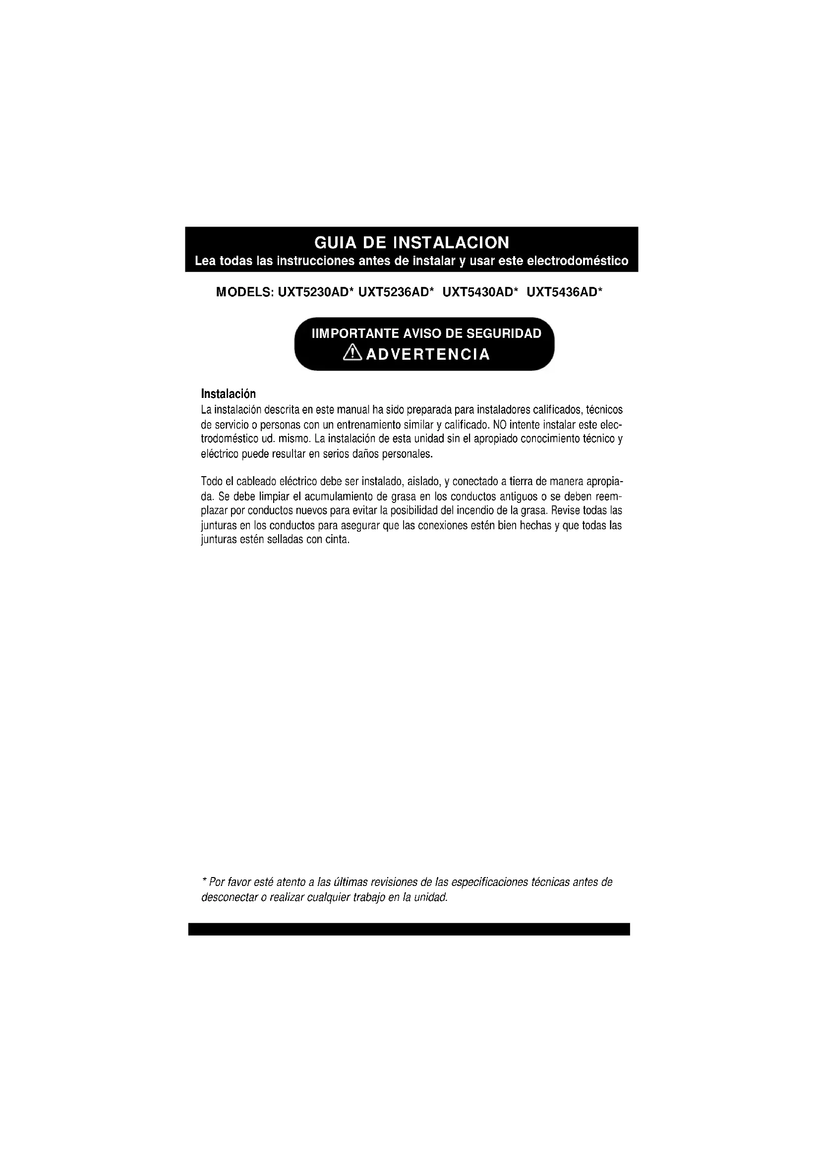 - Instalación -6GUIA DE INSTALACION Lea todas las instrucciones antes de instalar y usar este electrodoméstico Instalación La instalación descrita en este manual ha sido preparada para instaladores calificados, técnicos de servicio o personas con un entrenamiento similar y calificado. NO intente instalar este elec- trodoméstico ud. mismo. La instalación de esta unidad sin el apropiado conocimiento técnico y eléctrico puede resultar en serios daños personales. Todo el cableado eléctrico debe ser instalado, aislado, y conectado a tierra de manera apropia- da. Se debe limpiar el acumulamiento de grasa en los conductos antiguos o se deben reem- plazar por conductos nuevos para evitar la posibilidad del incendio de la grasa. Revise todas las junturas en los conductos para asegurar que las conexiones estén bien hechas y que todas las junturas estén selladas con cinta. p. 5