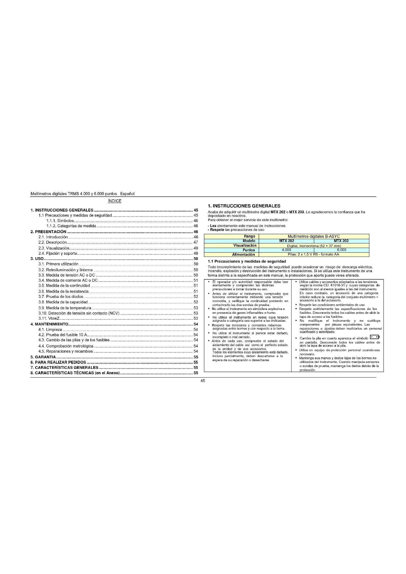 Acaba de adquirir un multímetro digital MTX 202 o MTX 203. Le agradecemos la confianza que ha depositado en nosotros. Para obtener el mejor servicio de este multímetro: - Lea atentamente este manual de instrucciones - Respete las precauciones de uso Rango Multímetros digitales B-ASYC Modelo MTX 202 MTX 203 Visualización Digital, monocroma (52 × 37 mm) Puntos